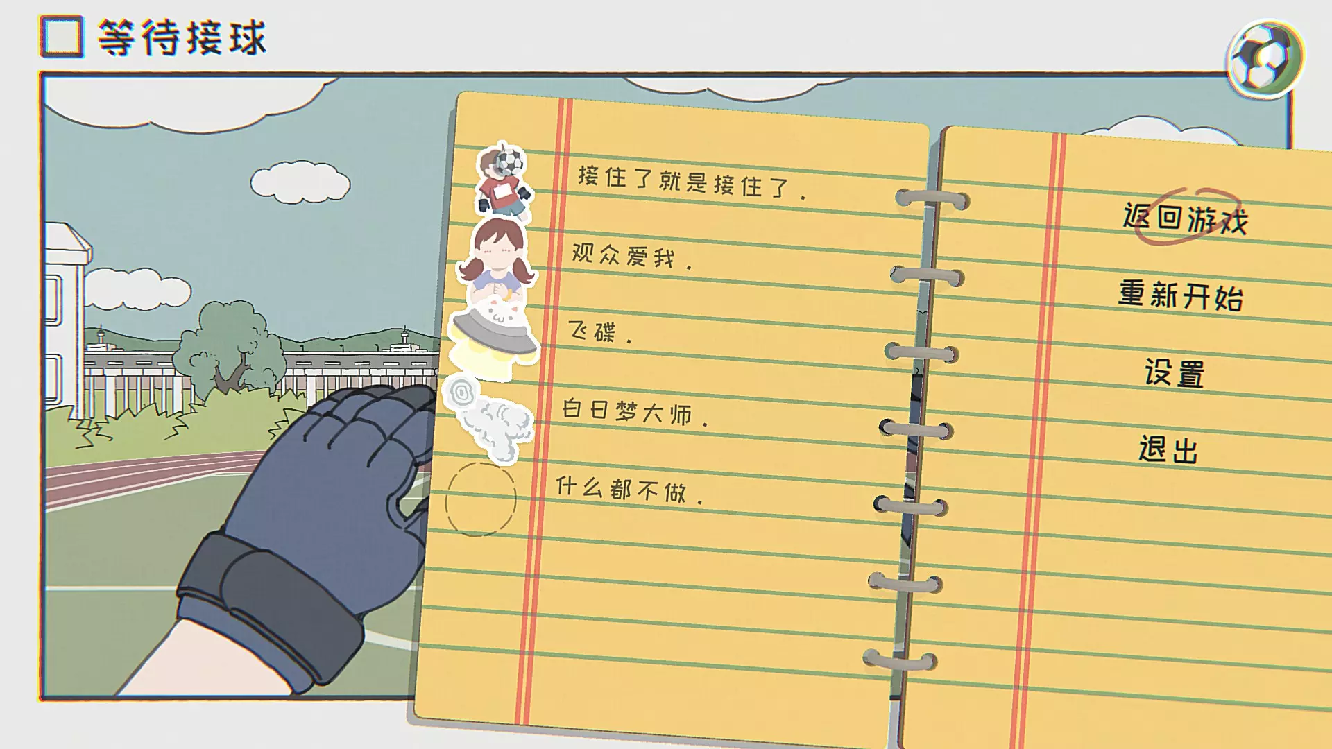 结束了就是接住了。该接球的时候在干别的事,打其他贴纸时容易跟着一起触发。 观众爱我:视角转向左侧带有颜色的小姑娘,按交互键和她招手三次。 飞碟:天空偏左上角有一只指向右下的手,手的右下方有一朵每隔几秒会动一次的云,盯一会儿便会出现飞碟。 白日梦大师:右边天空有一把手枪状的云,交互后会进入打靶游戏,慢三百分即可。建议优先打增加时长的蓝色靶。 第十四关:等待奖项被宣布