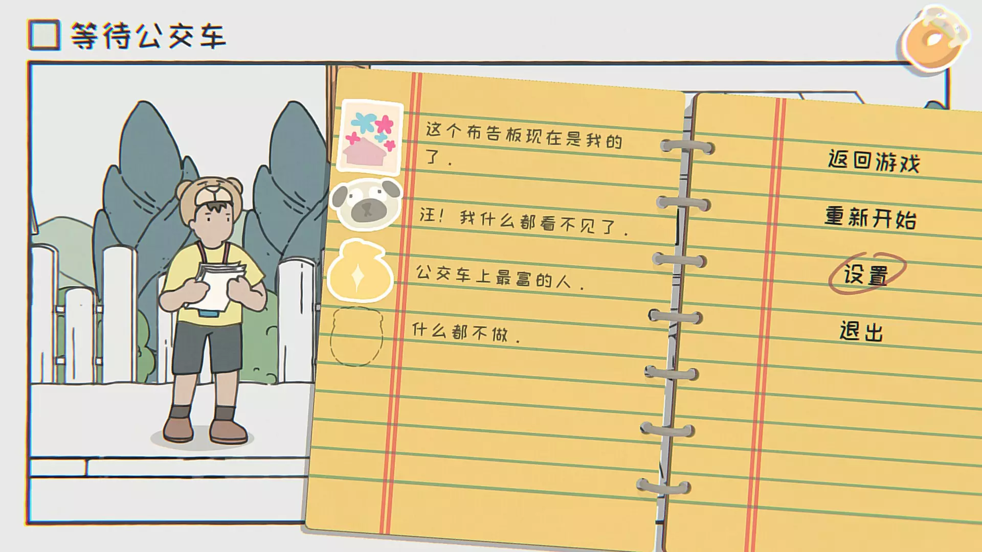 这个布告板现在是我的了。去左侧发传单的人手上拿传单,一张一张覆盖在布告板之前的海报上。 汪!我什么都看不见了。去左边人手里拿传单,走回布告板,拿着传单的手向右下移镜头贴到狗的脸上。 公交车上最富的人。有人乘坐飞毯飞过后会在左侧(左侧还有一个区域)留下一个钱袋,将它举着乘上公交车即可。 什么都不做。什么都不做。 第五关 等待下课