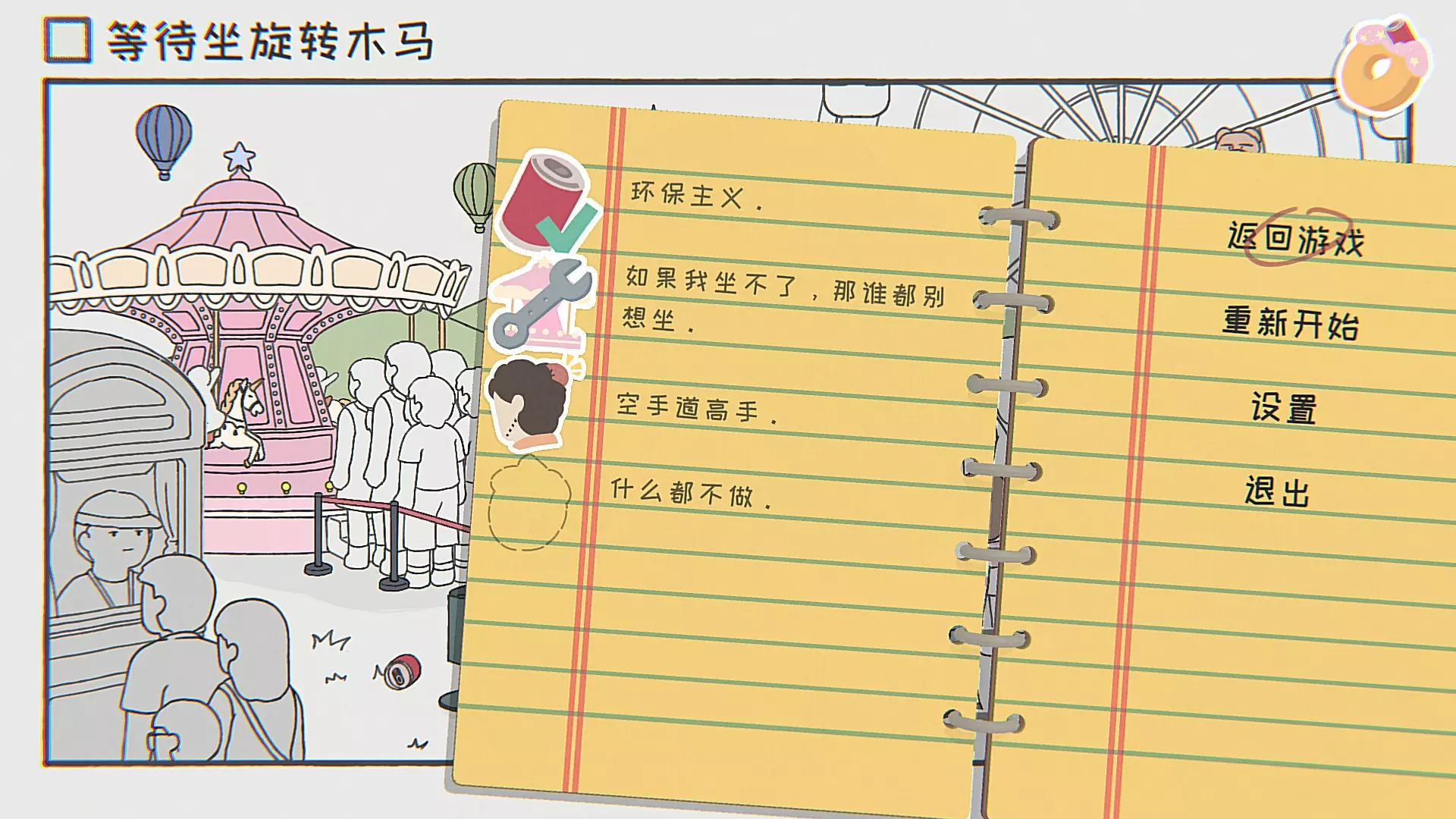 按照每关顺序简单做了下全贴纸的收集攻略,个人能力有限边打边做,缓慢更新中。 写在最前面(收集必看) 1.0.1版本更新:完成真结局后,标题界面的【Start】按钮将变为【Start?】,点击即可取回笔记本继续收集。 想要收集齐贴纸很难很难,有些难度设置的就是很高,除非你愿意花费几十个小时在上面否则我不建议你全收集。 第一关 等待教程