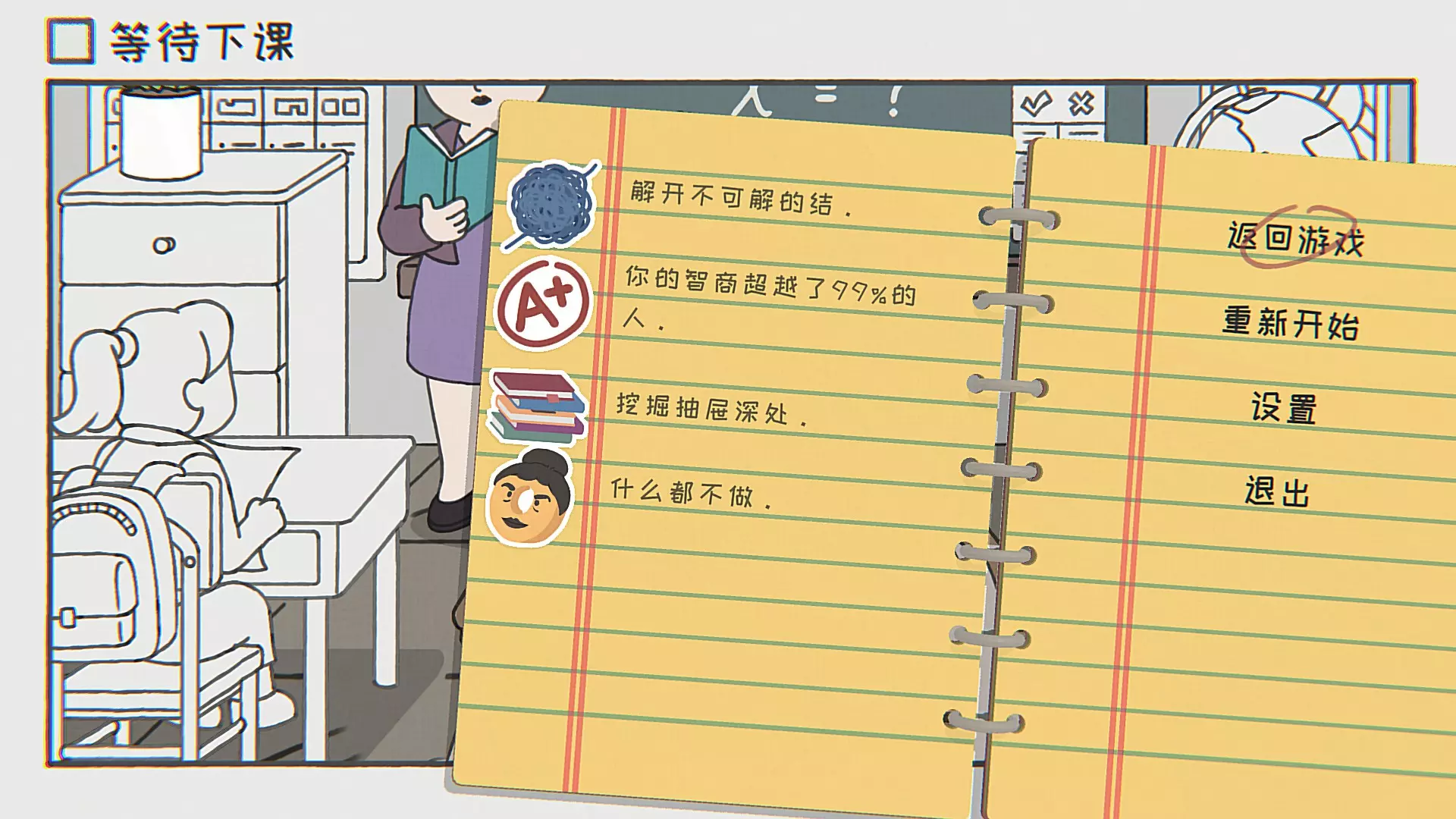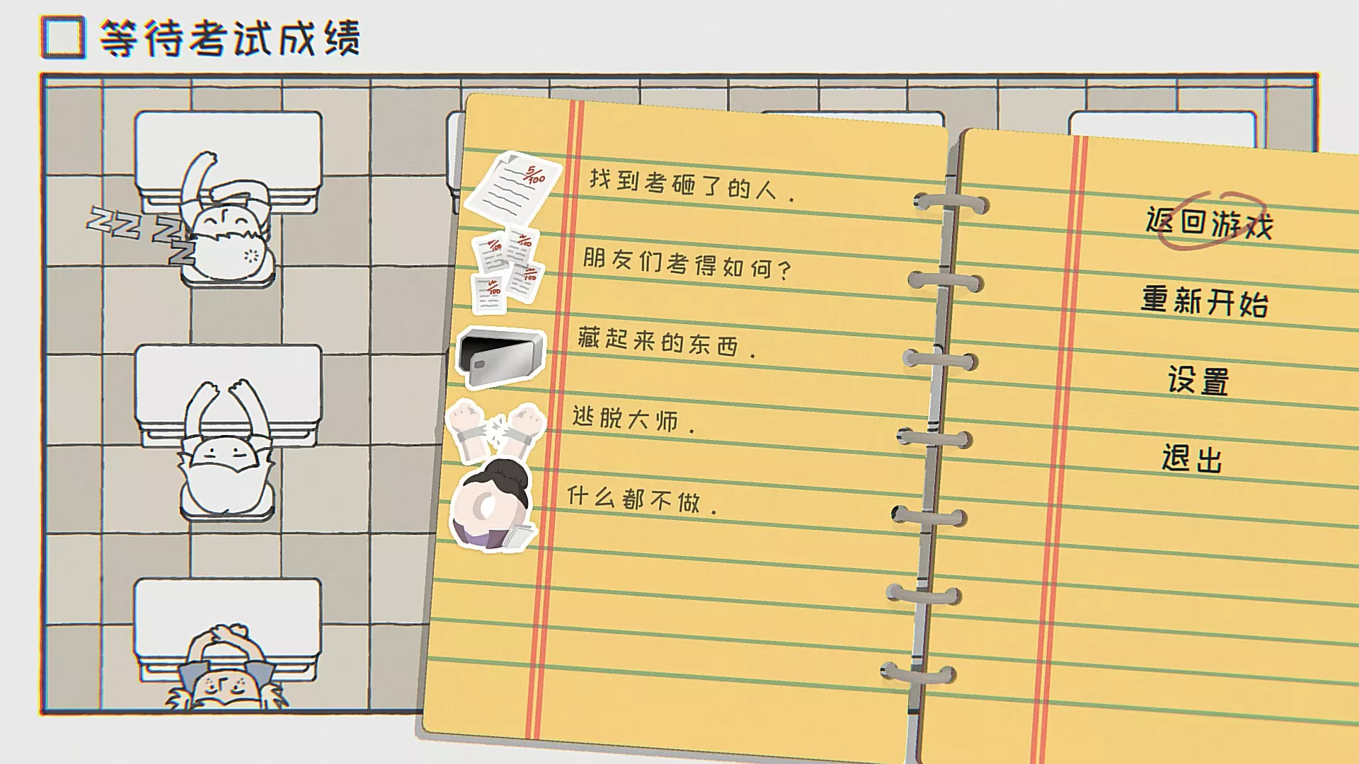 找到考砸了的人左上角第一个人,看他试卷。 朋友们考得如何?偷偷爬去看朋友们(带颜色的小人)的卷子,需注意老师发卷子发得比较慢,被发现抓回自己位置后还是能继续偷看,有三次被抓机会,第四次被抓就被固定不能移动了。 藏起来的东西爬至讲台底下,有一个密码箱,把座位上有人的点亮,不要点自己的位置。 逃脱大师移动时三次被老师逮到就会被老师用绳子绑椅子上,不停按交互键挣脱。 什么都不做什么都不做。 第十七关 等待堵车结束