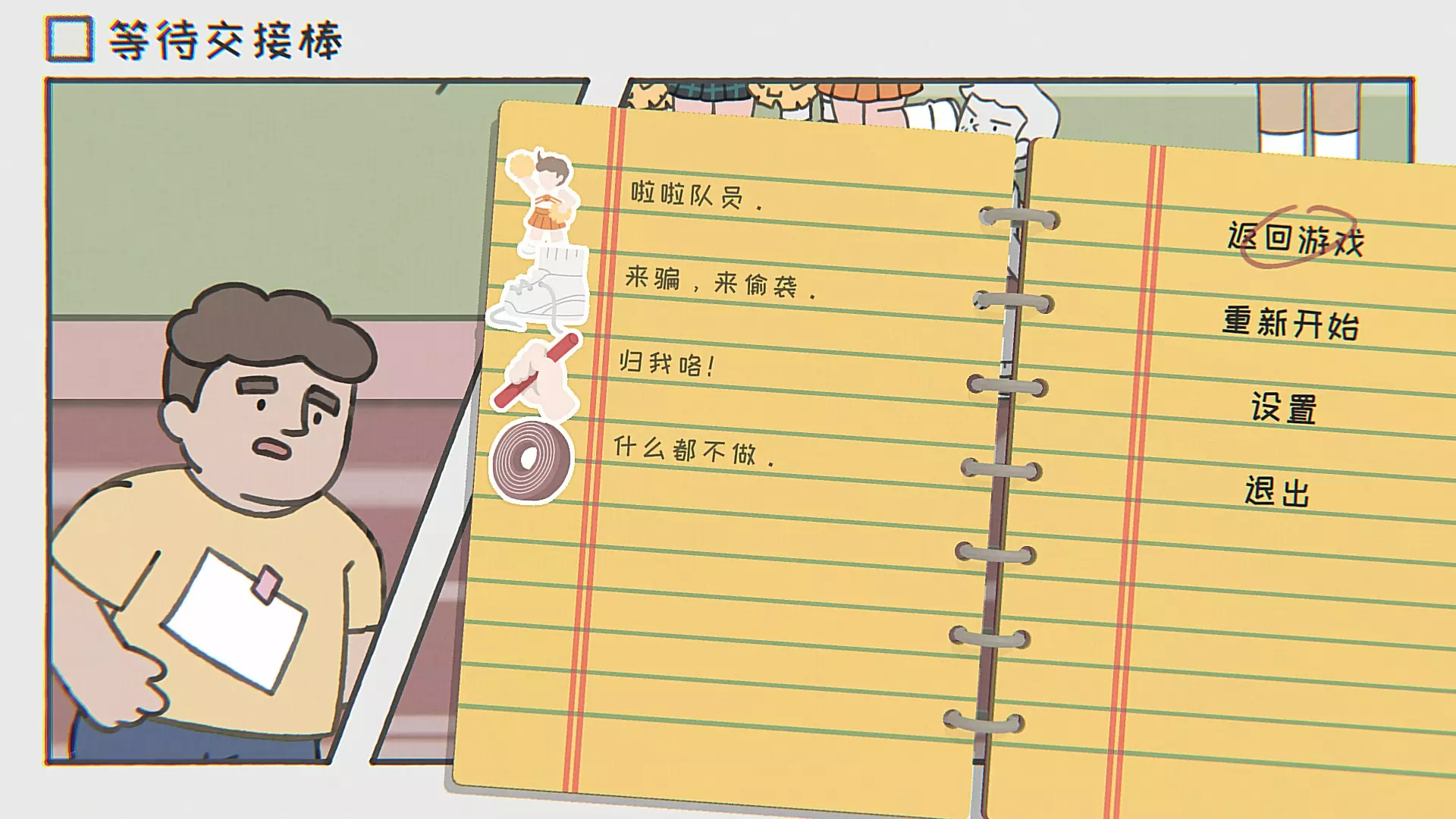 啦啦队员走向啦啦队,捡起啦啦花球站到队伍旁边,根据规律与顺序摇球。 在裁判看手机的间隙可以将对手的鞋带解开。 接上一个贴纸,将对手鞋带解开后,站在其旁边摆好姿势可夺棒。 什么都不做。 第十三关 等待接球