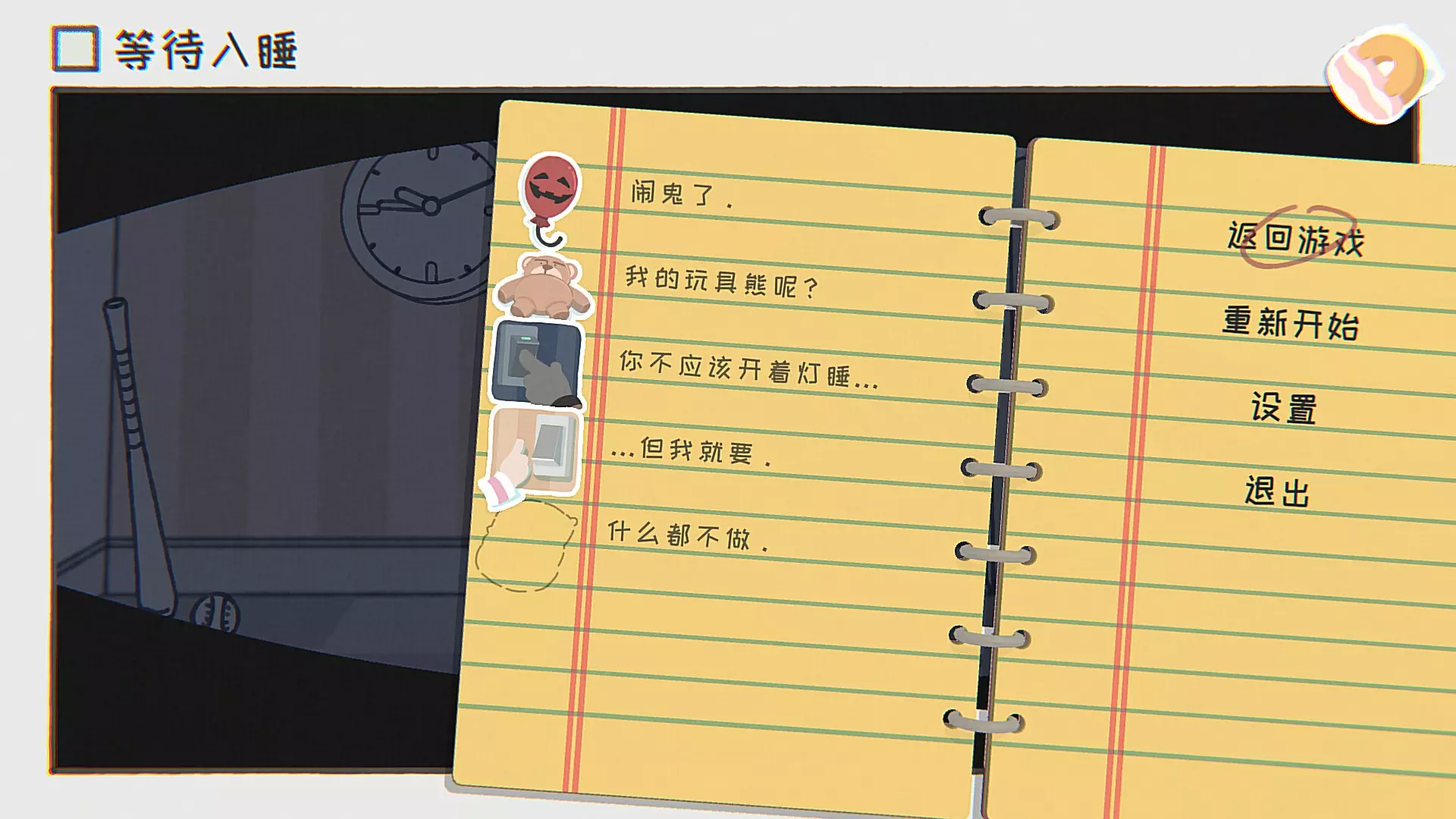 闹鬼了:视角对着左边的鬼脸气球,右边的衣柜鬼影,再看中间的炉子鬼火。 我的玩具熊呢?视角对着玩具熊,看到后就移开视线,在其他位置继续寻找,直到看到玩具熊站在床边。 你不应该开着灯睡觉:视角对着门边的灯开关,按交互键。 …但我就要:接上一个贴纸,家长把灯关掉后继续去开灯,关了继续开,直到再次打开灯。 什么都不做:什么都不做。 第十二关 等待交接棒