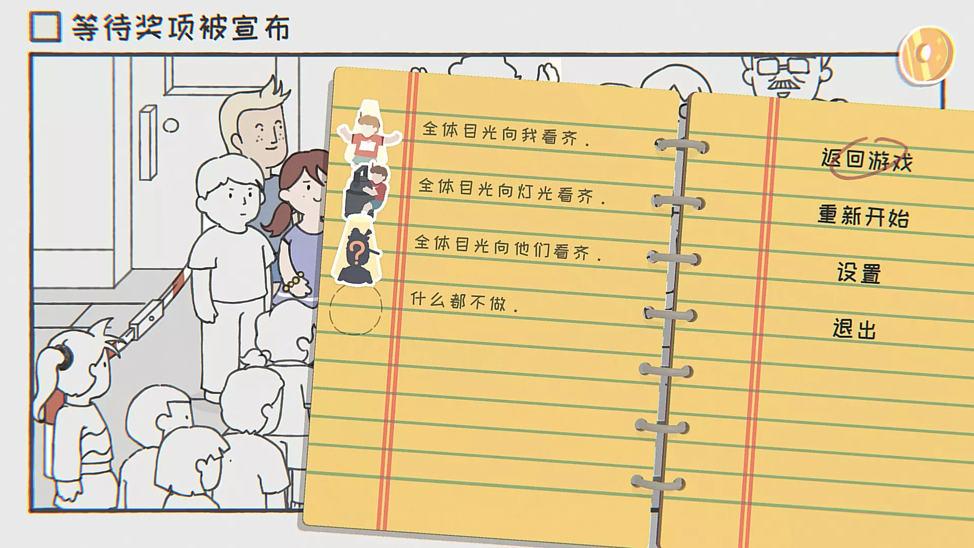 全体目光向我看齐,跟着灯光走动,然后紧贴着其他获奖人在灯光下移动。 全体目光向灯光看齐,向屏幕左边移动,与栏杆交互后走进左边的门,跳上移动的聚光灯。 全体目光向他们看齐,接上一个贴纸,抱住聚光灯后控制聚光灯向身上闪着星星的角色照去,目标位置大致在人群的四个角落。 什么都不做,什么都不做。 第十五关 等待电力恢复