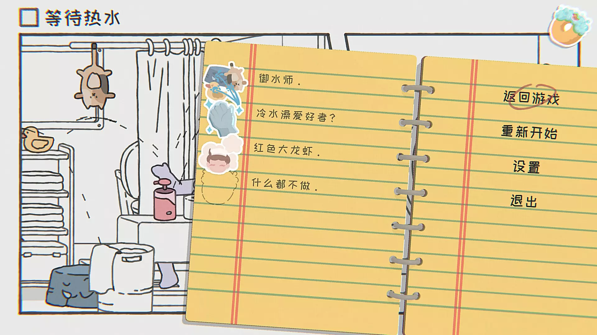 御水师控制水溅到每一个动物摆件。 冷水爱好者?将水温调到最冷并持续一段时间。(按交互键会调出调水温界面) 红色大龙虾需将水温调到最高并持续一段时间。 什么都不做。