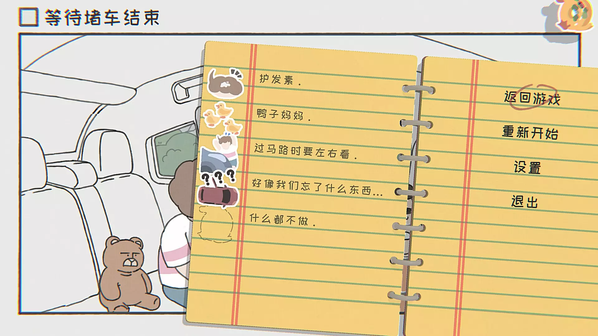 护发素把窗户摇下来,鸟屎掉到头上。(x) 鸭子妈妈把三只小鸭带到最上方水池,可以一只一只带。 过马路时要左右看,避免被车撞。 好像我们忘了什么东西……下车后等待,直到堵车结束,自驾车开启也不上车。 什么都不做,什么都不做。 第十八关 等待坐旋转木马