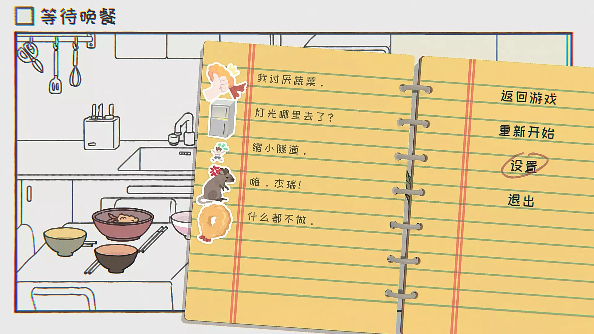 我讨厌蔬菜靠近餐桌拿起碗,接住炸虾直到弹出贴纸。(只接住炸虾) 灯光哪里去了?走近冰箱,拉开冰箱门一条缝,然后反复让冰箱内灯开关。 缩小隧道走到右边客厅(右边还有一个房间),右边进入缩小隧道一路往左走。 嗨!杰瑞!缩小之后往左走到厨房,进入老鼠洞。 什么都不做什么都不做。 第九关 等待电视广告结束