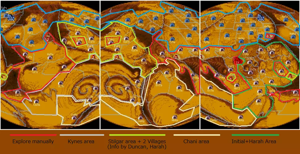 名称尽量简洁明了。前两个字母是区域名称,后两个字母是区域内的聚落名称。宫殿和村庄没有后缀,这是显而易见的(村庄通常命名为“区域-拓荒者”)。地区:Ар—阿拉基斯,Ct—卡尔法,Ту—图奥诺,Hb—哈班尼亚,Ox—奥克斯廷,Ts—齐姆波,Bl—布莱丹,Eg—厄尔格森,Hg—哈格,Cg—西拉戈,Си—锡哈亚,См—塞利明;沙虫名称如下:Тб—塔布,Тм—蒂明,Тк—图耶克,Хг—哈格,Сл—克兰姆,Ц—齐敏,Ст—谢特,Пт—珀特。例如,CtTm(沙虫挖掘者)指的是卡尔法-蒂明。哈克南家族的要塞以蓝色标记,信息基于第一天存档的二进制数据。2022年游戏中的地图即将推出,我正在玩1992年的游戏。