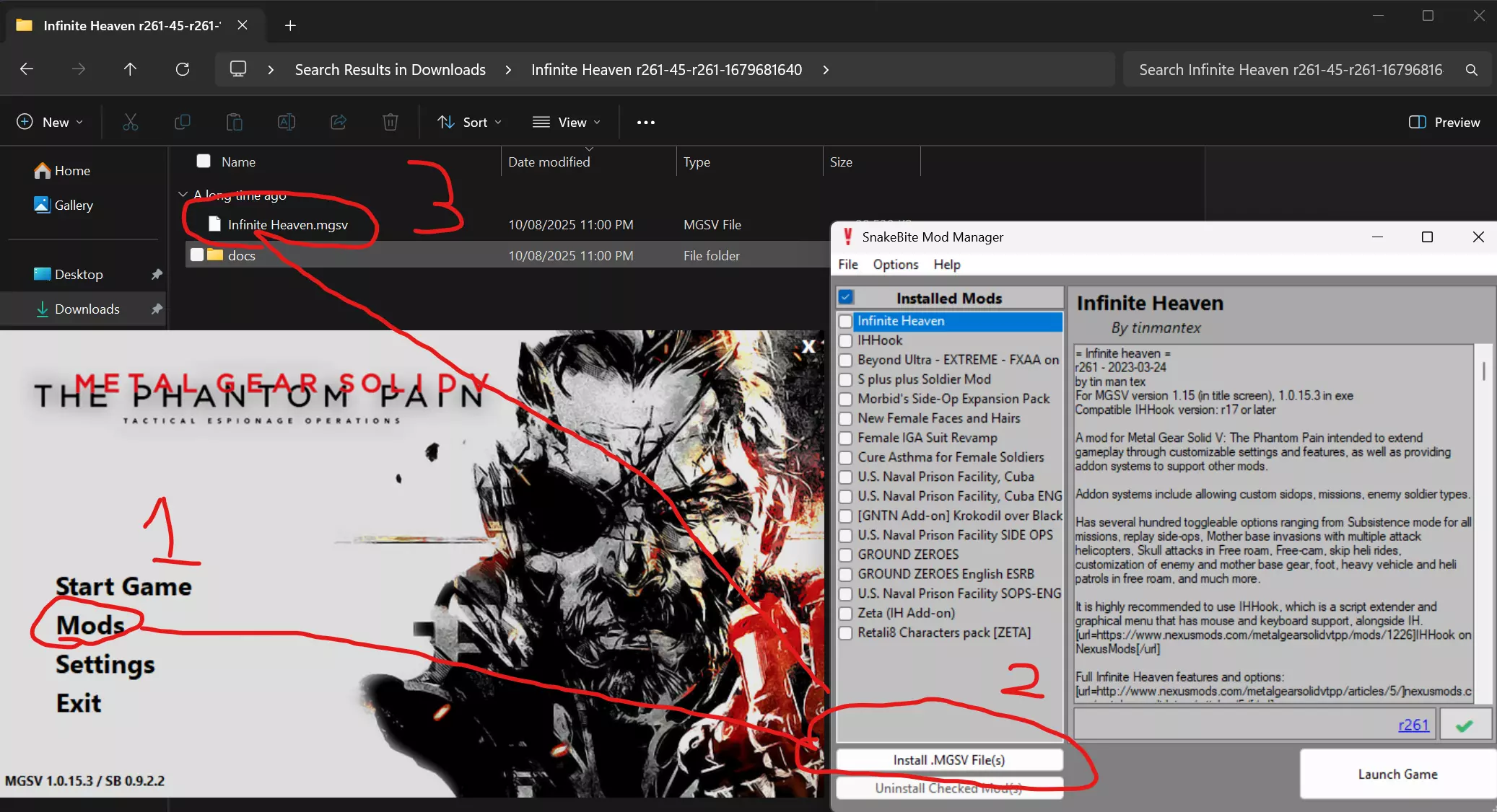 本指南使用【U.S. Naval Prison】和【Ground Zeroes】模组将《潜龙谍影:原爆点》导入《潜龙谍影V:幻痛》游戏中。 我并未创建本指南中使用的任何模组或软件。这是基于我个人经验编写的指南。 你需要同时拥有《潜龙谍影:原爆点》和《潜龙谍影V:幻痛》才能使用本指南——本指南并非盗版指南。 如果你是新手,本指南还将教你《潜龙谍影V》模组安装的基础知识! 开始之前——安装Snakebite Mod Manager SnakeBite Mod Manager是一款非常简单的安装工具,从相关平台下载.exe文件并运行,它将引导你完成安装过程。 在Snakebite中安装模组:打开Snakebite后,导航至“mods”选项卡,点击“Install .”。打开【潜龙谍影V:幻痛】,然后选择你下载的扩展包(扩展包格式为.mgsv),其他所有扩展包均通过此流程安装。