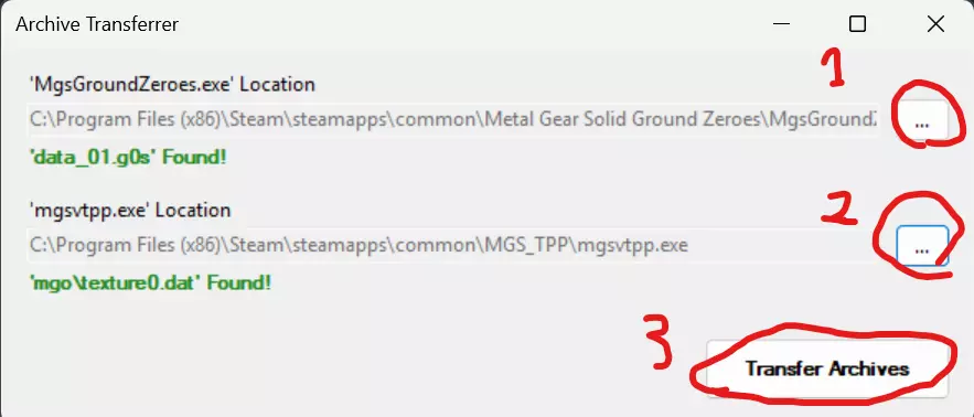 开始前 - 文件转移 文件转移工具可将《合金装备:原爆点》的存档文件转移至《合金装备V:幻痛》的可执行文件中。 以管理员身份打开“存档转移工具”,选择《合金装备:原爆点》和《合金装备V:幻痛》的可执行文件即可,操作十分简单。 路径示例: Program Files (x86) Steam steamapps common Metal Gear Solid Ground Zeroes Program Files (x86) Steam steamapps common MGS_TPP