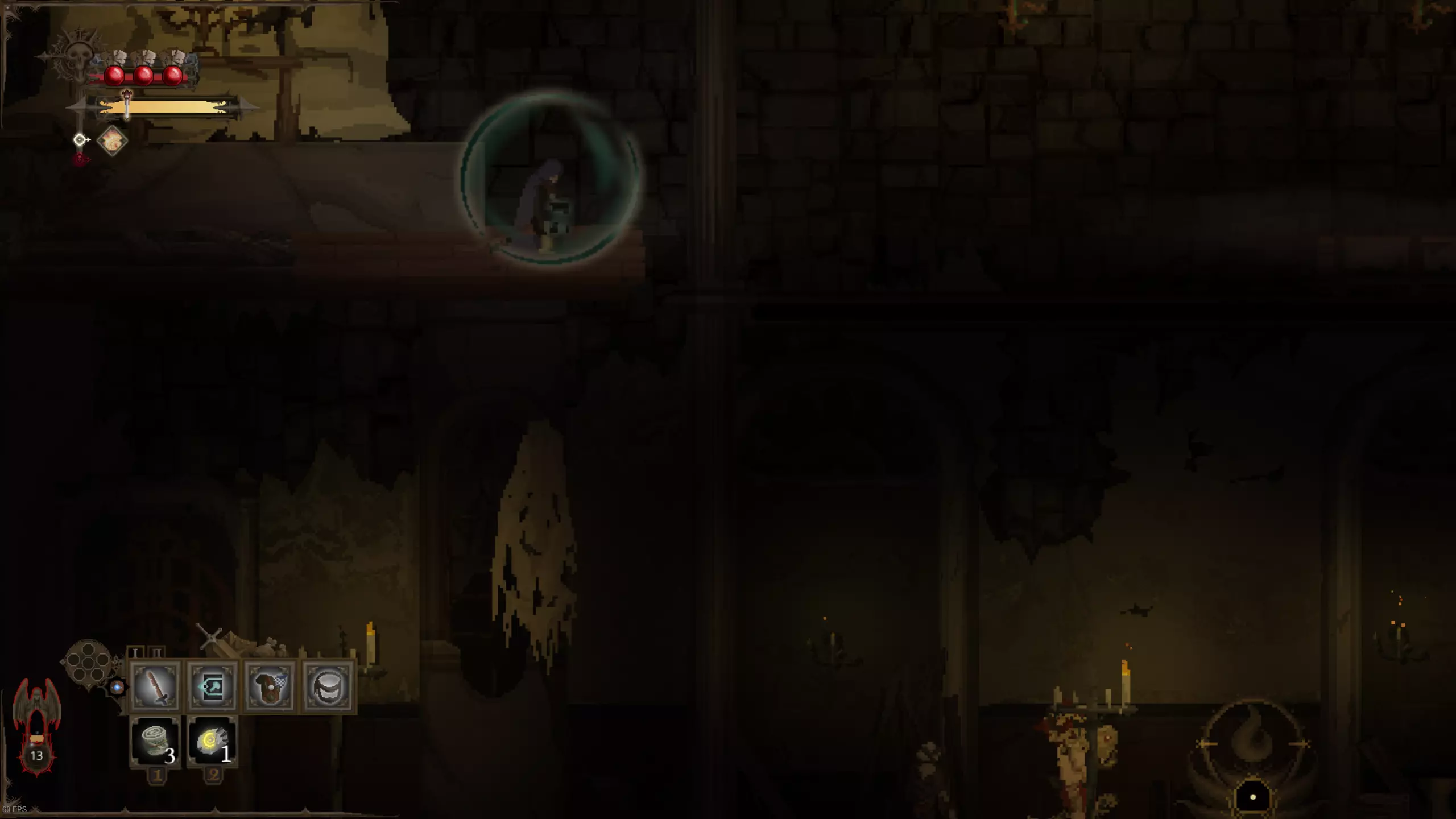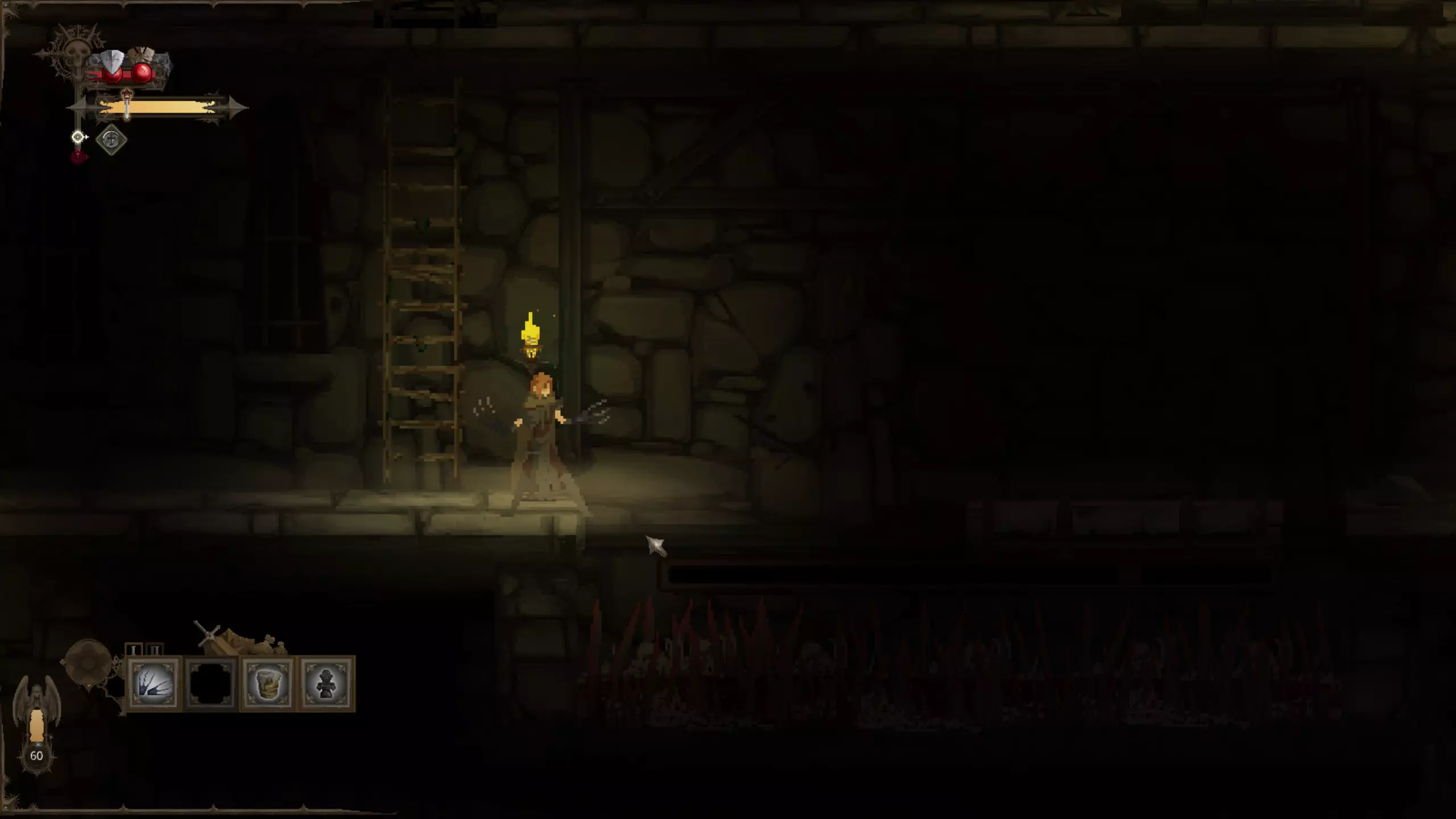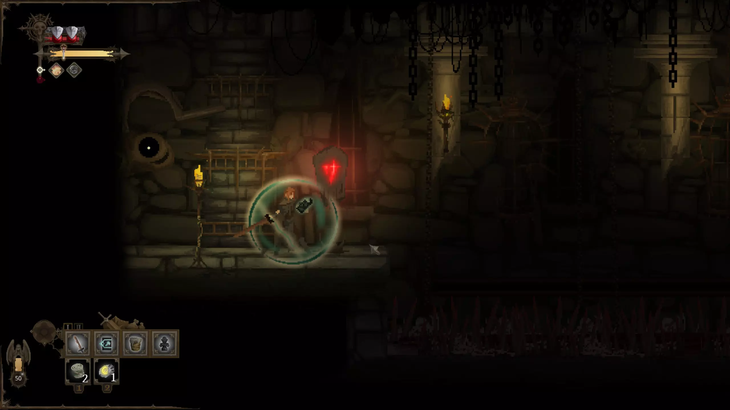 留意上下方环境 《黑暗献祭》中无法跳跃。但你时常需要向下探索,偶尔也需向上探索。利用窥视机制查看前方情况。按住上键或下键即可激活窥视功能,此时镜头会缓慢上移或下移,展现更多即将到来的区域。