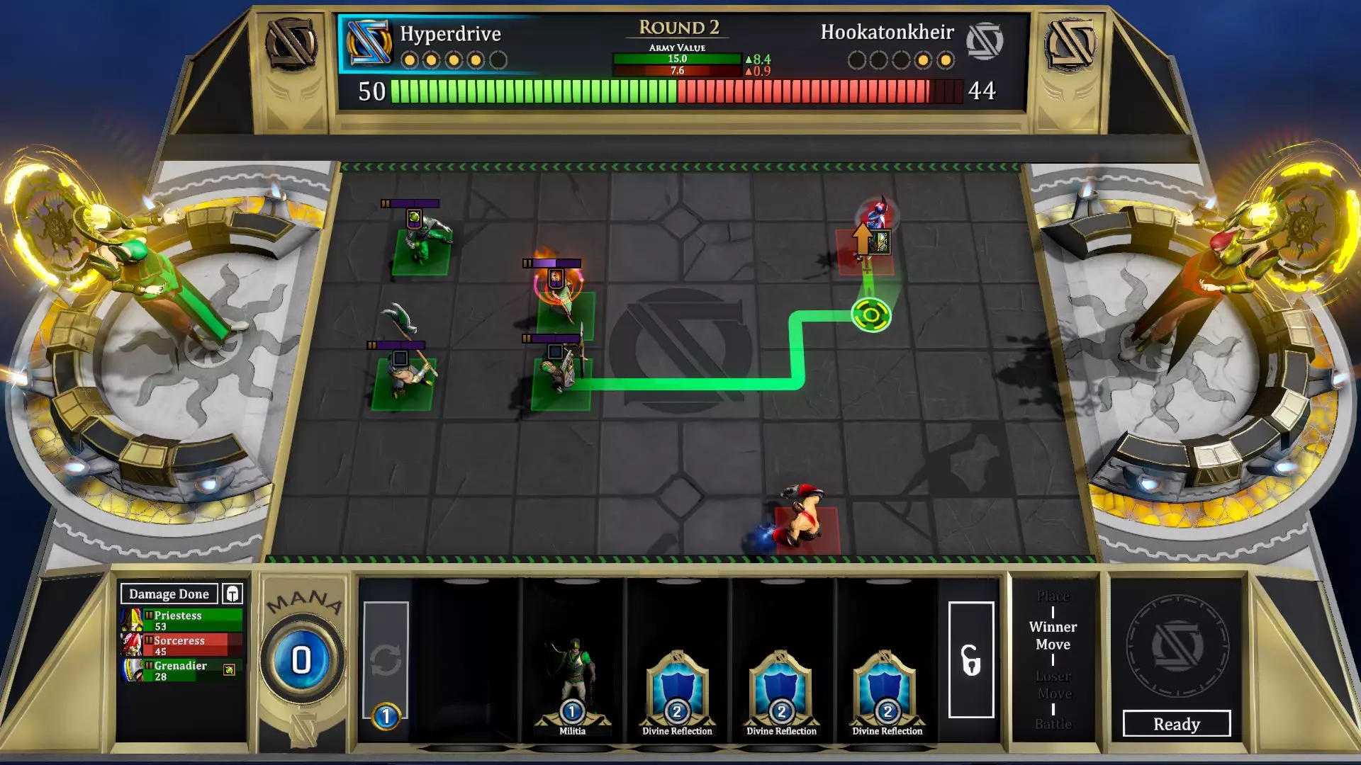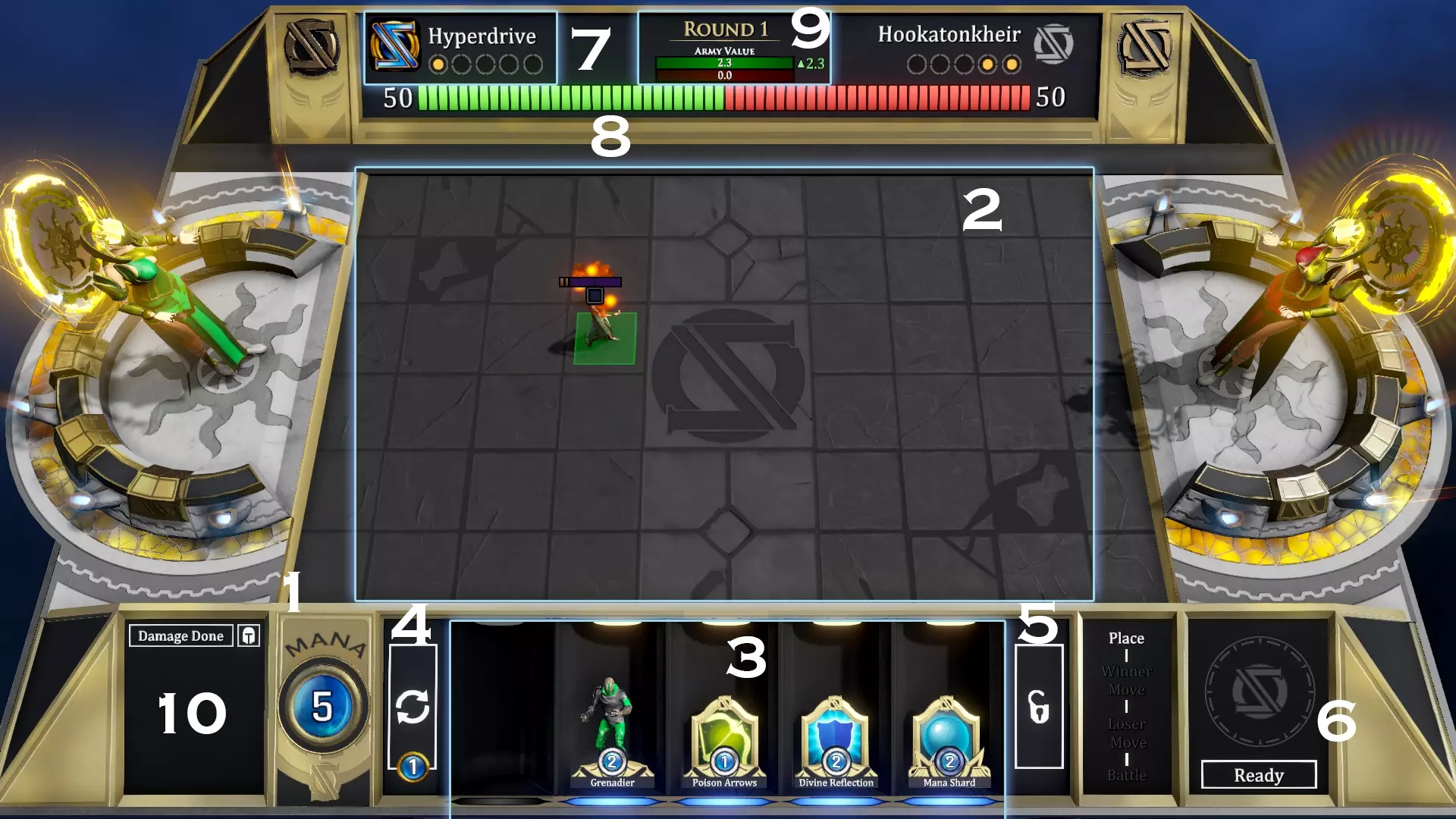 法力值:消耗可用的法力值将单位和技能置于战场。每个卡牌上会显示其法力值消耗。 游戏区域:这是你和对手放置单位的地方。你只能在自己神明所在的半场放置单位。 商店:从商店中选择单位和技能并将其置于战场。相同的单位或技能可以堆叠起来进行升级。 刷新:支付法力值消耗,刷新商店以获得新的单位和技能。 锁定:如果对当前商店内容满意但本回合无法购买任何东西,可以点击此按钮将商店内容锁定1回合。即使处于锁定状态,空槽位也会重新生成。 计时器:在线对战时请密切关注,以免超时。单位上限:显示你在任意时刻可在场上部署的最大单位数量。 生命值:此处显示你的神明生命值。一旦生命值归0,你将失败。 军队价值:显示哪一方军队更强以及优势程度。将鼠标悬停于此可展开查看更详细信息。 伤害计量表:密切关注此计量表,以确保你的单位按预期发挥作用。 控制方式 左键点击并拖动可将任意棋子放置到棋盘上(前提是你能负担其费用)。此操作也可用于移动单位。 将鼠标悬停在单位或技能上可查看其更多信息。 按TAB键可查看当前选牌的详细情况。回合阶段 每个回合可分为以下阶段: 放置:这是唯一允许你部署单位和使用技能的阶段。 胜者移动:上一回合的胜者可以移动其单位。 败者移动:上一回合的败者可以移动其单位。 战斗:所有单位完成移动后,战斗开始。 移动