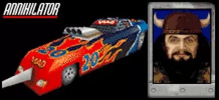 载具:法拉利F999 最高速度:270英里/小时 0-60英里加速时间:2.1秒 整备重量:1.1吨 赛车编号:51 对手等级:1 强度(1-5):1 可抢夺?:否 出现于:仅包含在Splat Pack中 描述:“他驾驶着赛道上最快的赛车之一……也是最脆弱的之一。与他正面相撞,就能把他撞飞上天!” 建议:“小行星”出现在Splat Pack的初期,是一个相对容易对付的对手。他并非你遇到的最具攻击性的车手——但肯定比机械狂人更具威胁。阿什特罗伊德和他的座驾【费拉里F999】,似乎与斯嘉丽夫人和她的【费拉里F666】极为相似——两者驾驶风格相同,车名和外观相近,最高速度和整备质量也完全一致……费拉里F999与F666之间唯一真正的区别在于,阿什特罗伊德的车去掉了带刀片的前保险杠,但0-60英里/小时的加速时间却整整缩短了两秒,使其成为原版《死亡赛车》和《死亡赛车:飞溅包》中加速最快的车辆,比弗拉德的【歼灭者】还要快0.1秒。 在《死亡赛车:飞溅包》中,所有强度等级为1的车辆里,费拉里可能是第二容易被摧毁的,仅次于【塔希塔轿跑】。浪费这辆跑车是个相对简单的任务;作为中置发动机车型,其侧面是特别的弱点,极易受到侧面碰撞的影响。较低的整备质量意味着“费拉里”(Fearari)也容易被大多数其他车辆推来搡去,而且当从侧面被撞击时,会无助地被猛撞到墙上——这使得它相当容易被摧毁。瓦尔·赫拉:劈刀