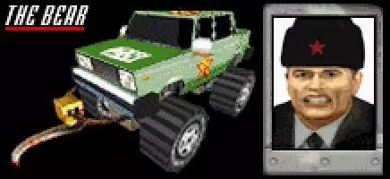 车辆:【熊】 最高速度:150英里/小时 0-60英里加速时间:9.4秒 整备重量:1.4吨 赛车编号:28 对手等级:1 强度(1-5):3 可夺取:是,等级低于55 登场作品:《死亡赛车》及《死亡赛车:飞溅包》 描述:“驾驶着乌克兰制造的怪物卡车,带着伏特加引发的宿醉,伊万糟糕的心情让他成为一名危险的对手。” 建议:伊万的宿醉显然让他心情不佳,他是你在赛季初期会遇到的最具攻击性的车手之一。他会毫不犹豫地发起攻击,而且有在赛道上到处跟着你的习惯。 初次遇到“熊”时,它的样子会给人留下深刻印象——超大号轮胎加上前置的摆动刀片。好在第一印象并非全部,伊万并不像看起来那么难对付。 “熊”是一辆糟糕的车:操控性差意味着伊万经常会失控打转,较高的重心也让它很容易翻车。尽管车头有刀片,但“熊”在正面碰撞时很脆弱,而且它的强度等级也比它看起来的要低。 伊万的“熊”是可以被窃取的,从55级或更低等级开始就能窃取。不过,你实在没有理由使用它,因为它比红鹰更慢、更轻,加速度也更低。熊式战车比黄鹰有重量优势,但这实在不足以成为你换车的理由。要是你那病态的好奇心占了上风,开车前可别喝伏特加…… 切割者:Countslash