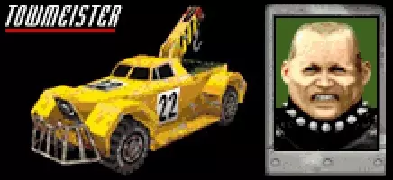 载具:拖车大师 最高速度:160英里/小时 0-60英里加速时间:9.1秒 整备重量:2.0吨 赛车编号:22 对手等级:2 强度(1-5):4 可夺取:是,等级低于38 登场作品:《死亡赛车》及《死亡赛车:碰撞包》 描述:“他就像一条狂暴的废料场恶犬,会嘶吼着扑向你的鲜血和机油。一旦被他抓住……你就等着变成‘汉堡肉’吧。” 建议:“疯狗”皮布尔会不惜一切代价试图撞毁你,哪怕是把你推进酸液池也在所不惜。拖车大师(Towmeister)车身沉重且装甲精良,所以你需要一辆坚固的车辆才能将其摧毁。在斗牛犬(Pitbull)开始出现时,将你的攻击能力升级到当时可用的最高水平会有所帮助,但这仍然不是一件容易的事。 斗牛犬的卡车底部沉重,由于装载臂的缘故,外形也很笨拙,这意味着它很少会翻车。正面碰撞是拖车大师唯一真正的弱点,而且需要多次尝试才能真正削弱它的装甲。 在《死亡赛车》(Carmageddon)和《死亡赛车:飞溅包》(Splat Pack)中,当等级达到38级或更低时,就可以窃取拖车大师。它是中后期赛季的绝佳选择,比两辆初始车辆或史克鲁伊·路易的旋风号(Screwie Lewie's Twister)都要重且坚固,不过速度比这三辆车都慢不少。实际上,拖车大师或凯迪拉克肥猫能带你通关本赛季,因为它们比耕耘者更全面。基于此,拖车大师是激进型玩家的更佳选择。 猫咪拉戈尔:杀手猫咪