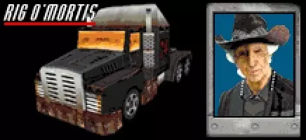 载具:【Rig O'Mortis】 最高速度:160英里/小时 0-60英里加速时间:7.6秒 整备重量:5.0吨 赛车编号:74 对手等级:3 强度(1-5):5 可抢夺:是,排名21以下 出现于:仅【Splat Pack】 描述:“所有卡车司机之母,这位小老太太可不只有助行架来保护自己。是时候让退休老人复仇了……” 建议:【Mother Trucker】是一个极其危险的对手,接近时应格外小心。她会毫无征兆地攻击其他任何车手,并且能轻松让“血腥包”中的几乎所有车辆失去行动能力。 “死亡之轮”重5.0吨,是《死亡赛车》及“血腥包”中所有参赛选手中最重的车辆(与“镇压者”并列全场最重)。巨大的卡车驾驶室高耸于赛道上的其他所有车辆(“怪物粉碎机”除外),能轻松压制“卡车大妈”遇到的任何对手。好在其最高速度略低于平均水平,且轴距较长,驾驶合适的车辆时,很容易对这个“老家伙”进行绕后攻击。 “死亡之轮”拥有惊人的装甲,只有少数特定车辆才能对其造成伤害,即便配备五级攻击性升级也不行——别指望“凯迪拉克肥猫”,它在这里帮不了你。犁式战车或镇压者可以通过快速的正面碰撞来削弱其装甲,但其他任何车辆都无法造成丝毫损伤。尸僵战车是目前最难摧毁的敌方车辆。 幸运的是,尸僵战车可以被窃取,并且在等级21或以下时就能解锁——对于赛季后期喜欢激进驾驶的玩家来说,这是一个绝佳选择。当进攻升级到五级后,几乎没有车辆能在被尸僵战车推撞时幸存下来,更不用说高速碰撞了。 OK 斯廷普森 / 朱西·琼斯:欺诈布罗科