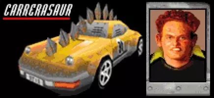 载具:卡雷拉龙 最高速度:180英里/小时 0-60英里/小时加速时间:3.6秒 整备质量:1.3吨 赛车编号:91 对手等级:1 强度(1-5):2 可抢夺:是,排名89以下 出现于:仅《喋血扩展包》 描述:“stig从他的旧大众车升级到了Porky Mo.Co.的最新型号。卡雷拉龙坚硬、快速且极其华丽……” 建议:stig带着新车回归《喋血扩展包》,驾驶方式与原版《死亡赛车》大致相同;在你攻击他之前,他相当被动,但现在他有了更快的车,会追捕你。“赛道恐龙”在几乎所有方面都是一辆更出色的赛车:速度更快、车身更重,0-60英里/小时的加速时间更是惊人地快了8.0秒。它保留了2级的强度评级,防护性能感觉与“大众工人”不相上下。低离地间隙的问题似乎也已得到解决,操控更加敏锐且响应更迅速。在“血溅包”初期,“赛道恐龙”绝对是一个 formidable 的竞争对手。 stig的赛车现在采用了后置发动机布局,与现实中的对应车型一致,这使得弱点转移到了车尾。幸运的是,摧毁它仍然不算太难——但车尾的弱点比车头或侧面更难瞄准。在《死亡赛车》系列的《Splat Pack》扩展包中,斯蒂格是唯一一位其座驾可被窃取的对手,而在原版《死亡赛车》中则不行。玩家在等级达到89级或以下时,可以窃取到“卡雷拉龙”赛车。最早在《Splat Pack》赛季的第三场比赛中就有机会窃取到它,其性能类似于“鹰II型”赛车的慢速版(但加速性能更优)。与同样在89级可窃取的另外两款赛车(回归的“田下双门轿跑”和“垃圾终结者”)相比,“卡雷拉龙”无疑更胜一筹,但它并不比“鹰II型”或“鹰II型”更具优势。 苏·博格:杜泽尔