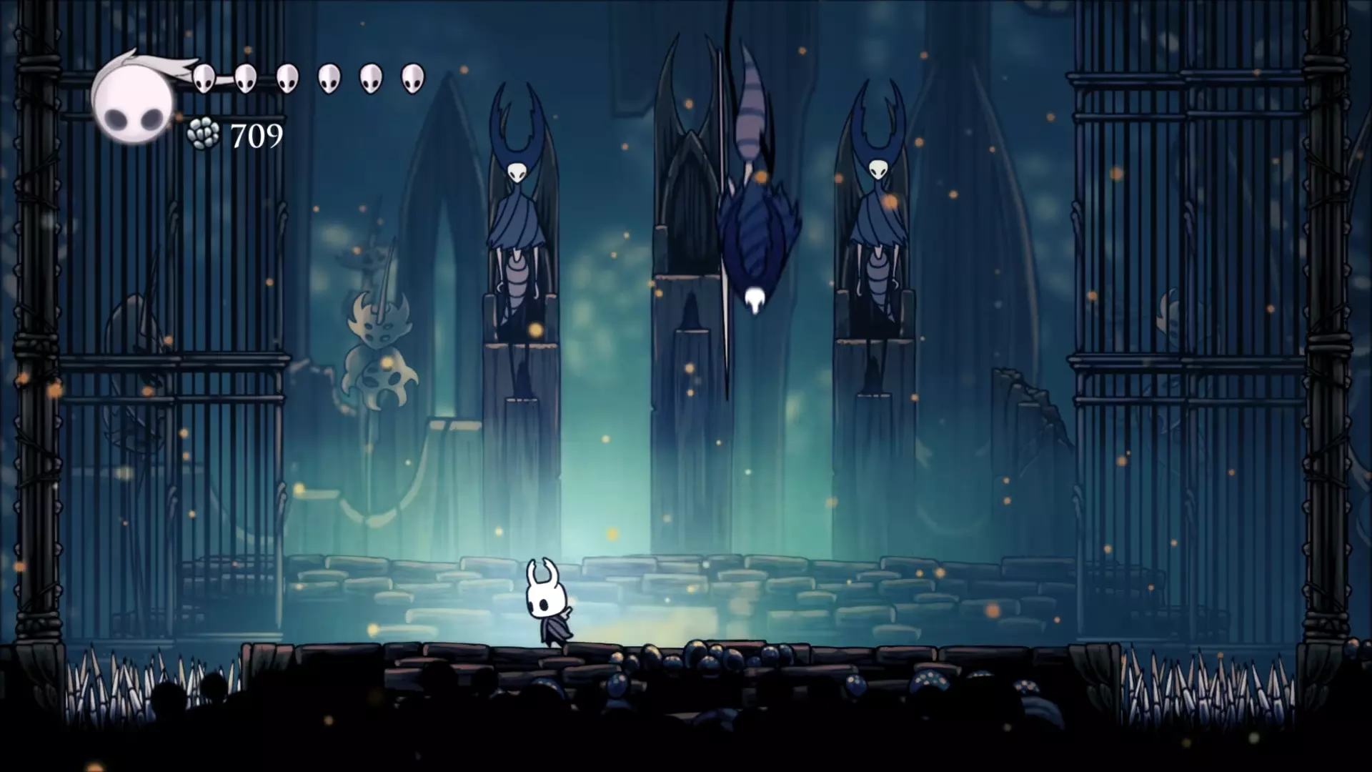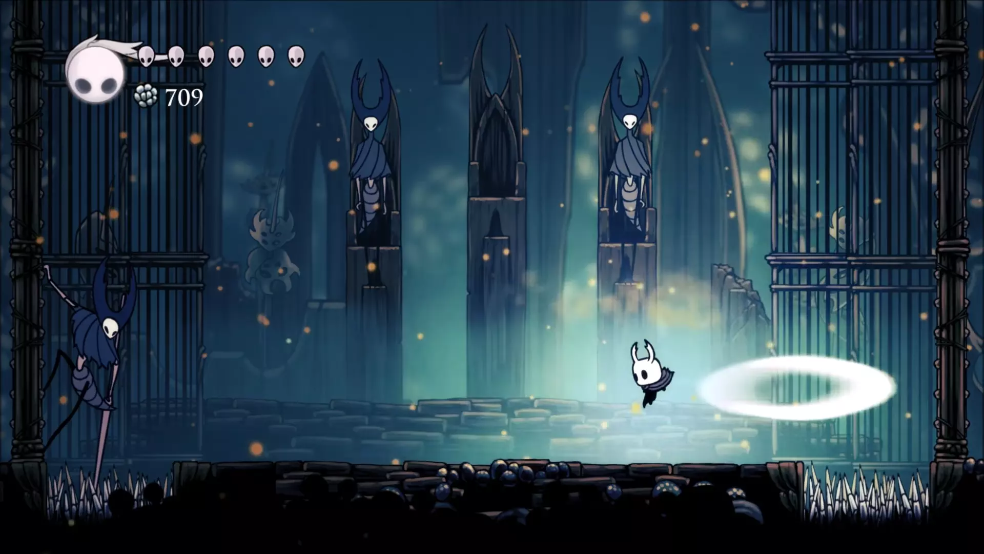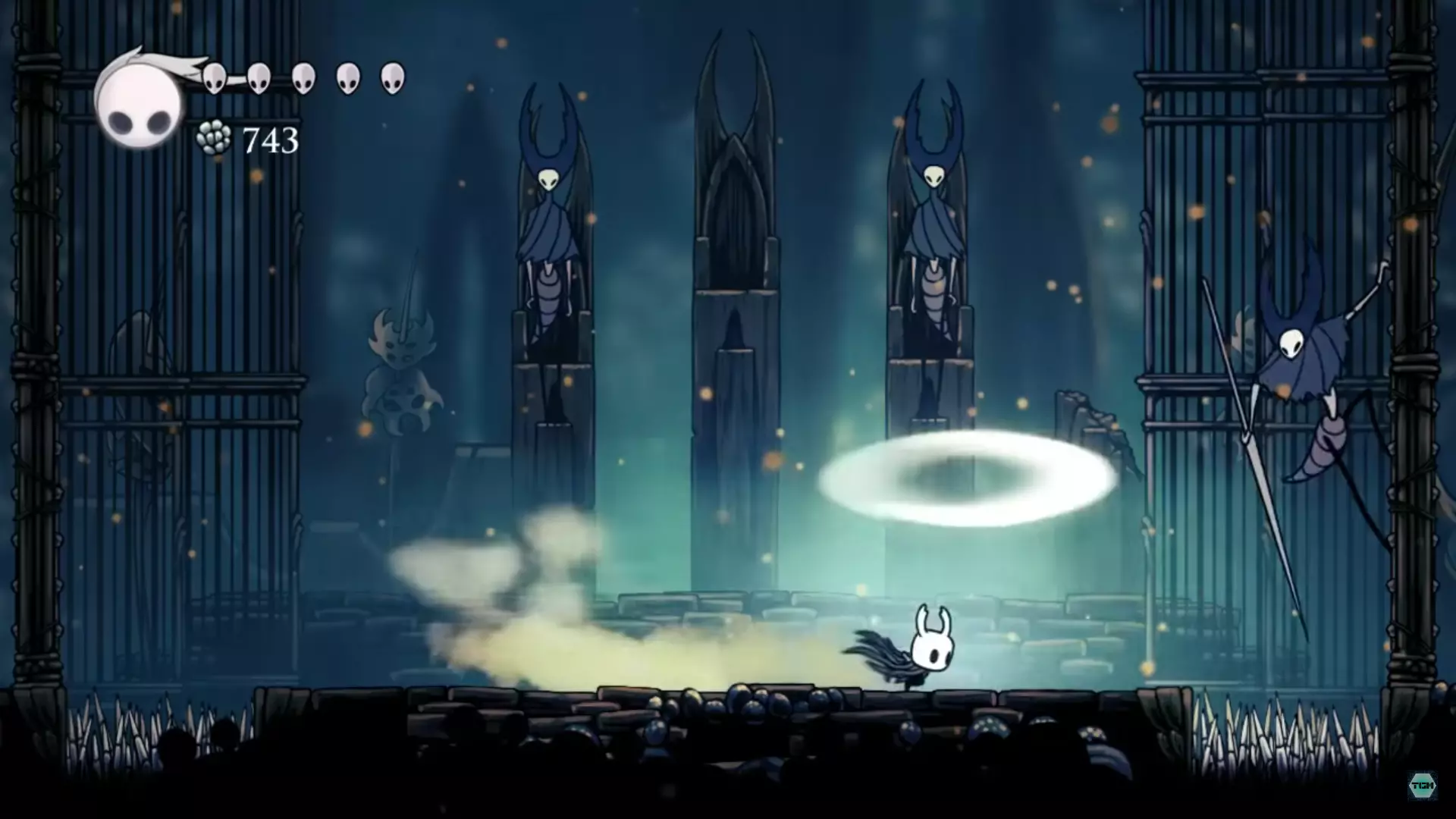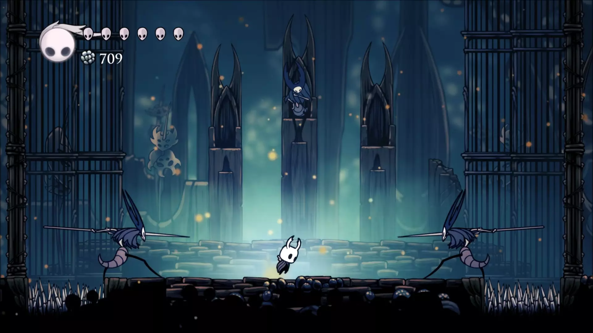 螳螂领主的低位姿势是这样的,当他处于这个姿势时,弹幕会低空袭来,这意味着你必须跳跃。(螳螂领主在左墙还是右墙都无关紧要。) 第一阶段结束 boss会不断重复他那3个招式,直到你攻击他足够多次后,他会退回自己的王座。在此期间,确保用你收集到的灵魂治愈自己。一定要只在这段时间治愈,因为在任何阶段的战斗中你都无法进行治愈。 第二阶段 在第二阶段,你将同时与剩下的两位螳螂领主战斗。战斗会很混乱,所以分析他们的招式并做出相应行动非常重要。两位螳螂领主拥有与第一位相同的三种攻击方式,但这两位会同时发动攻击,形成极具威胁的组合技。其中一种组合技是双方同时发动冲刺攻击。这种攻击虽容易应对,但必须把握好时机。