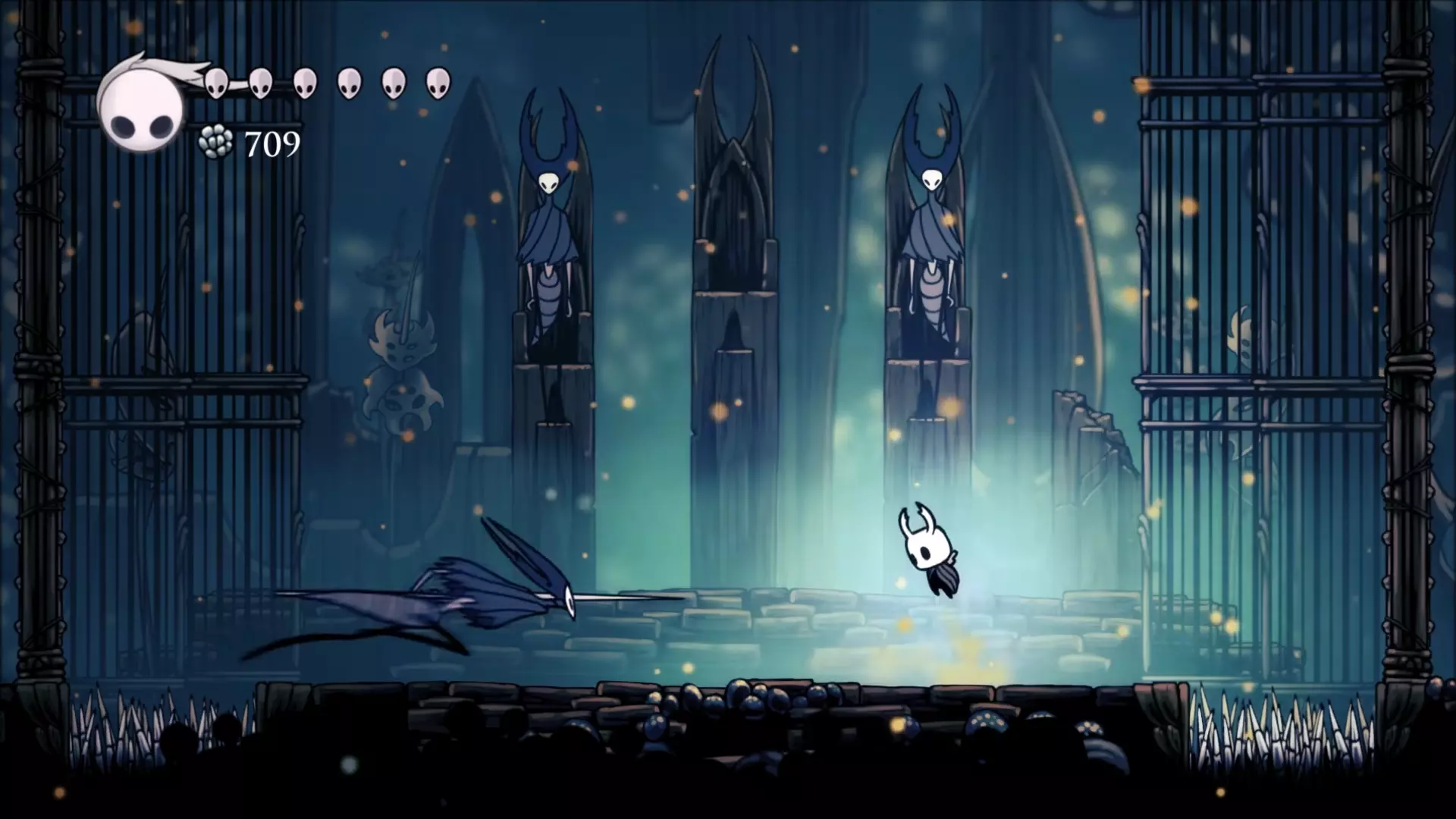 这是一份《空洞骑士》中与螳螂领主战斗时的实用技巧和注意事项指南 环境 战斗的第一阶段将面对位于中间的螳螂领主。战斗开始时,墙壁会降下,将你困在竞技场中。墙壁下方的两侧各有一个尖刺坑(务必避免跳入其中)。