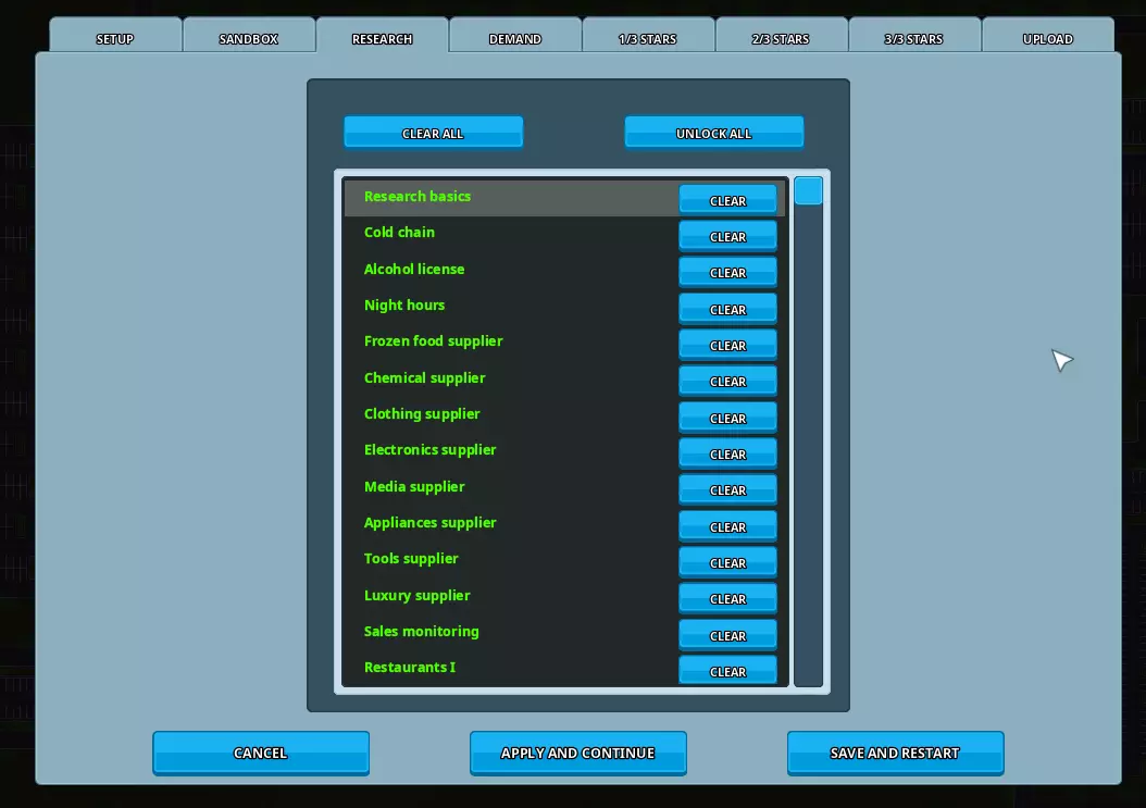 如果你使用非标准设置,建议在介绍信息中提及,以便玩家能提前了解特殊条件。 研究 在此标签页中,你可以为你的场景设置各种研究项目的状态。