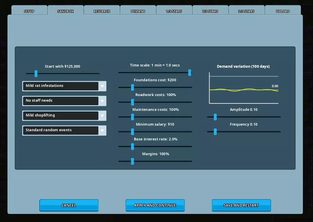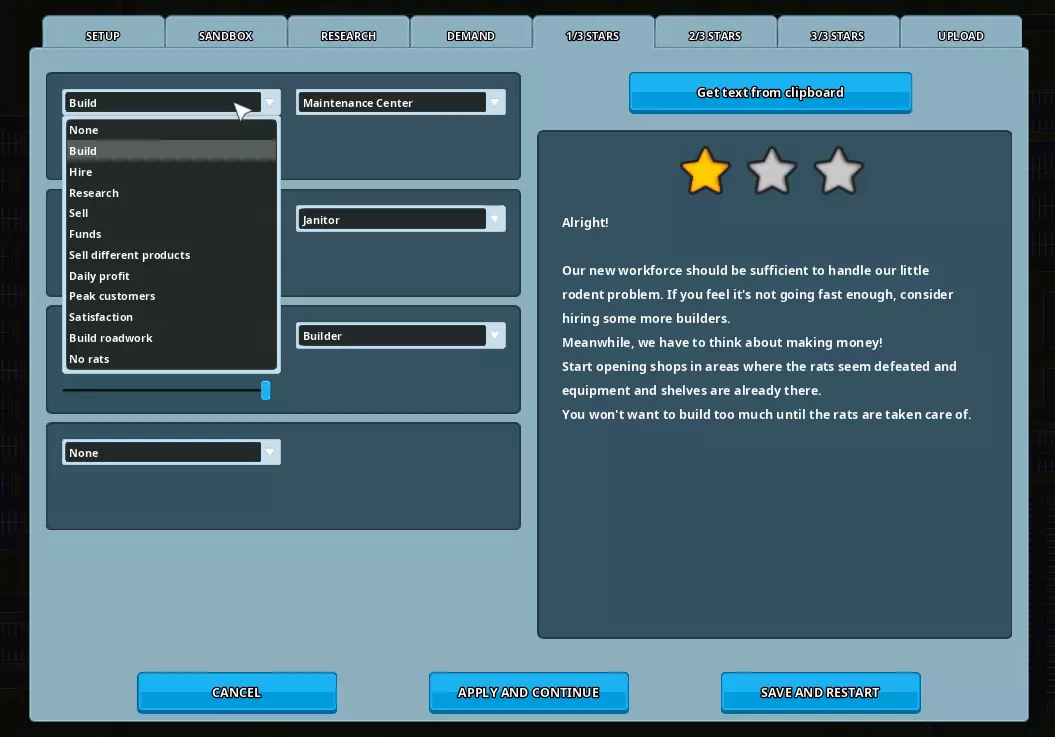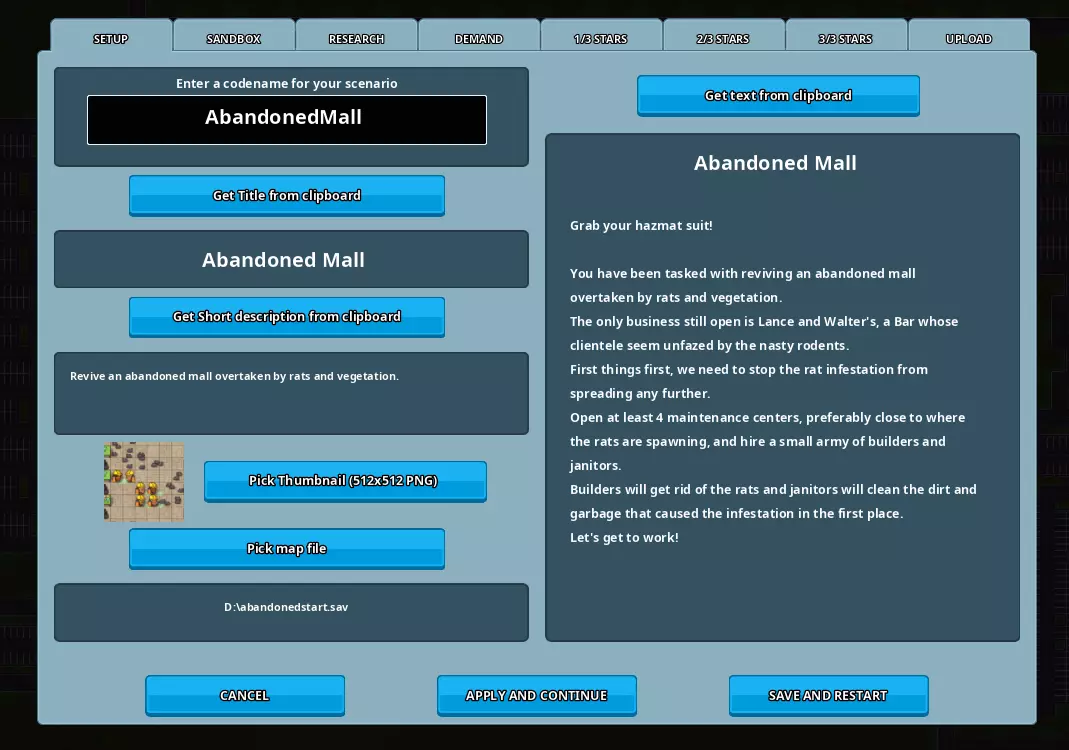 你可以在游戏外部使用你偏好的文本编辑器(记事本、写字板、Office等)保存各种场景文本。然后你可以选中这些文本,复制到剪贴板(Ctrl+C),再通过游戏内编辑器的各种按钮将其导入。 代号:为你的场景输入一个独特的代号。请注意:如果你在创意工坊分享了场景,然后又订阅了自己的场景,那么当你启动游戏时,你本地的场景将会被你最新上传的版本覆盖。 建议的做法是在上传场景前更改其代号(通常你可以为正在制作的场景使用“codenameWIP”,并在上传前将其更改为“codename”)。由于两者标题相同,你可以在新游戏菜单中开启调试覆盖层(F1)来显示代号,从而区分两者。 标题:为你的场景设置一个标题。 简短描述:一段简短描述,将显示在新游戏菜单和Steam创意工坊中。 文本:场景的介绍信息。其中应包含起始条件的描述以及第一个场景步骤的目标(参见场景步骤)。 缩略图:为你的场景选择一张512x512像素的PNG图片,该图片将显示在新游戏菜单和Steam创意工坊中。如果不设置,将使用默认图片。 地图文件:选择一个包含你希望场景起始地图的存档文件。如果不设置,将使用当前加载的地图。沙盒模式 在此标签页中,你可以为你的游戏场景设置各种沙盒参数。