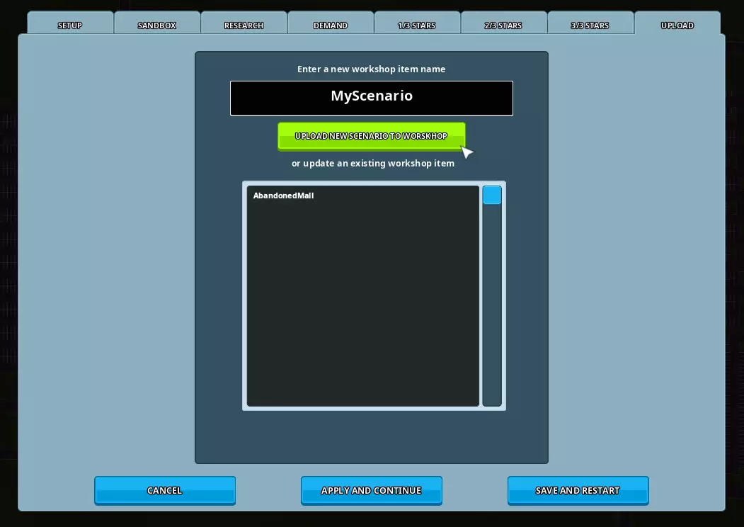 每阶段最多可设置5个目标。 每个阶段的文本是目标完成时显示给玩家的消息:应祝贺玩家完成当前阶段目标,并描述下一阶段的目标。 高级(模组) 你可以选择创建模组(图形和游戏玩法修改、新产品),这些模组将在每个场景阶段应用(包括场景完成后,即第4阶段)。 你的模组xml文件(以及任何引用的png图像)应位于你的场景文件夹中。 它们必须按以下方式命名: moddata_step1.xml -> 将在场景开始时应用。 moddata_step2.xml -> 将在场景的第2阶段应用。 moddata_step3.xml -> 将在场景的第3步应用。 moddata_step4.xml -> 将在场景完成时应用。 关于模组制作的更多信息,请阅读相关指南。 上传 在此标签页中,你可以将场景上传至Steam创意工坊,或更新之前已上传的场景。