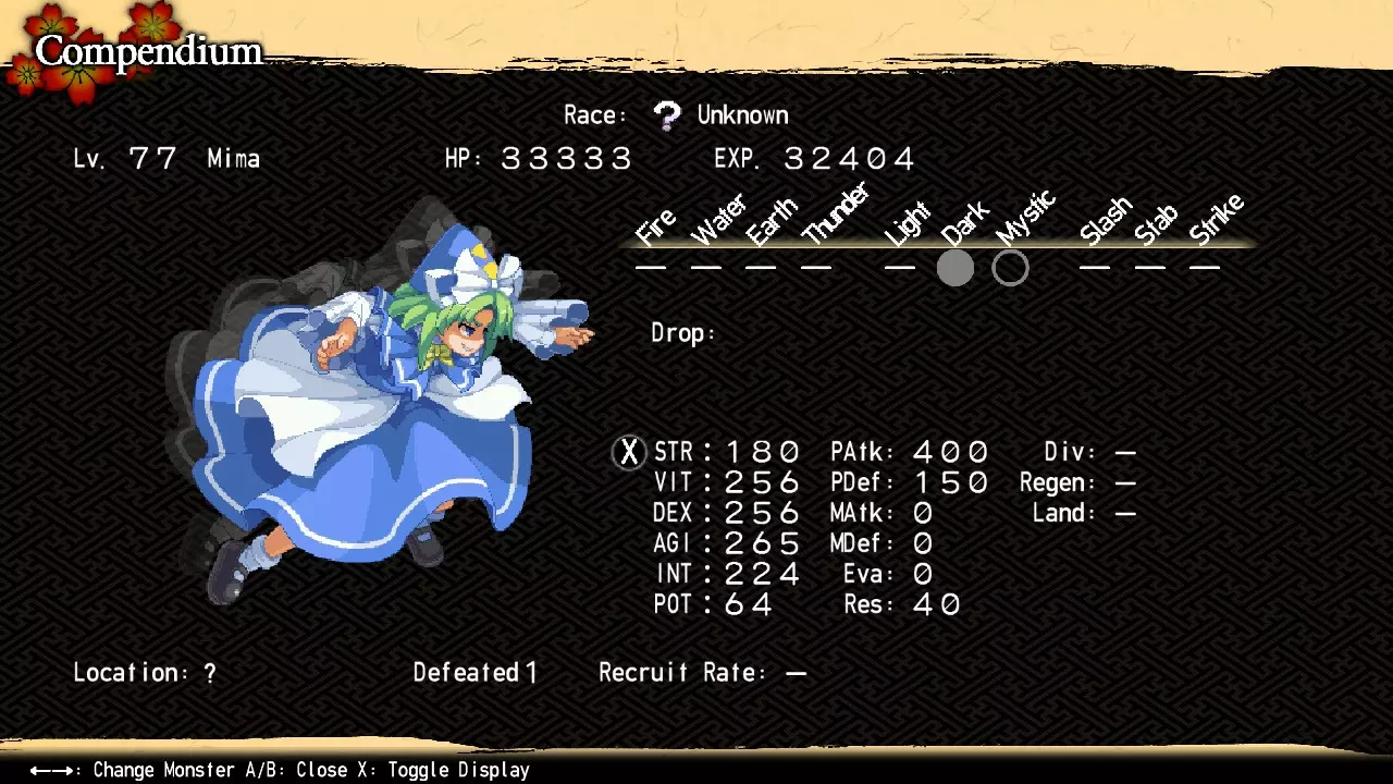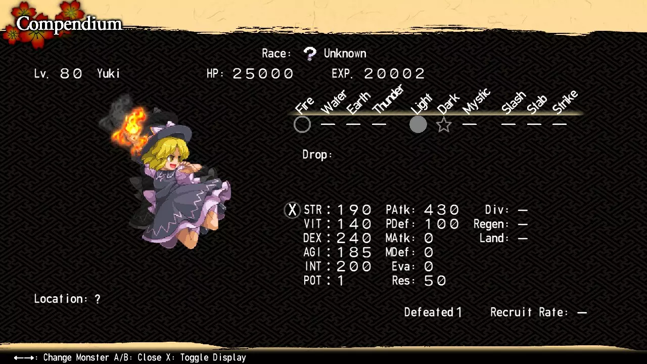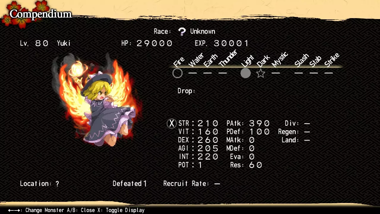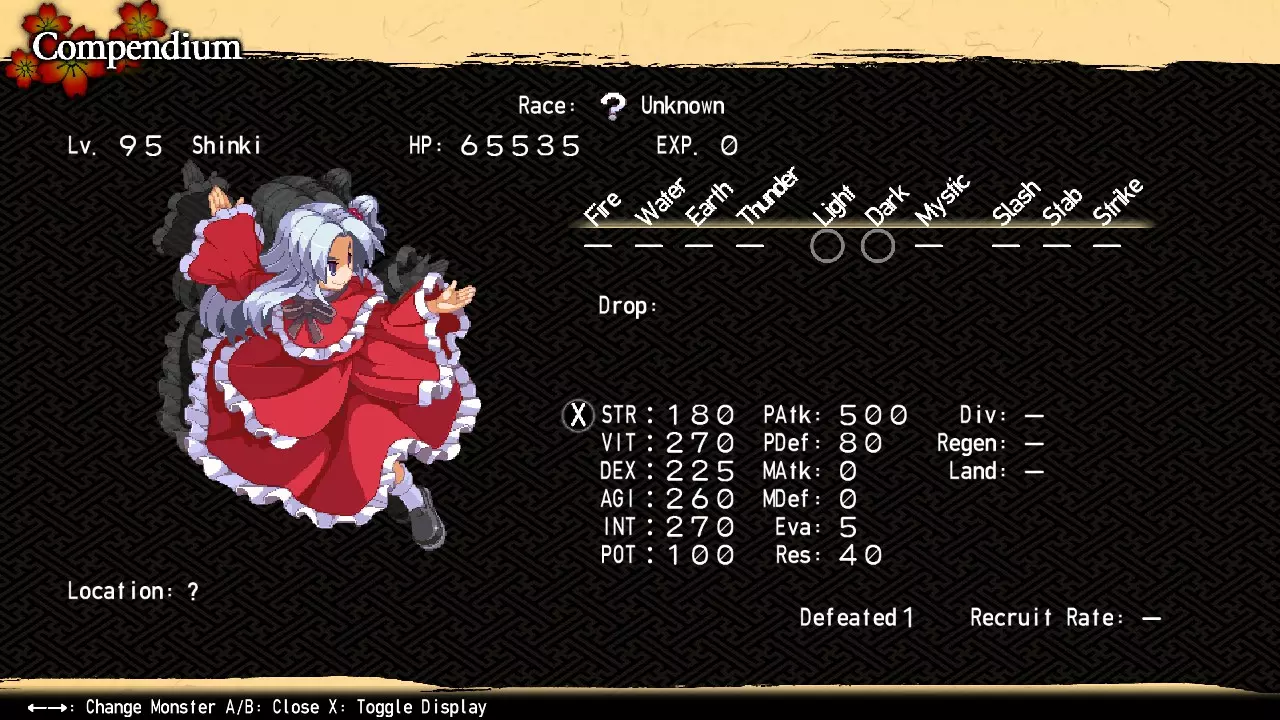 因此,神绮拥有三个阶段的力量(每个阶段都收录在图鉴中)。对于你的第一场战斗,我强烈建议激活一个或两个封印。此时击败未封印的神绮虽然并非完全不可能,但达到99级并获取混沌冥界和博丽神社地下的资源会让这一挑战变得更加可行。任何标有【*】的内容仅在 bonus dungeons 中出现,因此只能在重战时用于尝试击败神绮的强化形态。 【游戏后期最终头目】 神绮 位置:内黑圣所17区北部