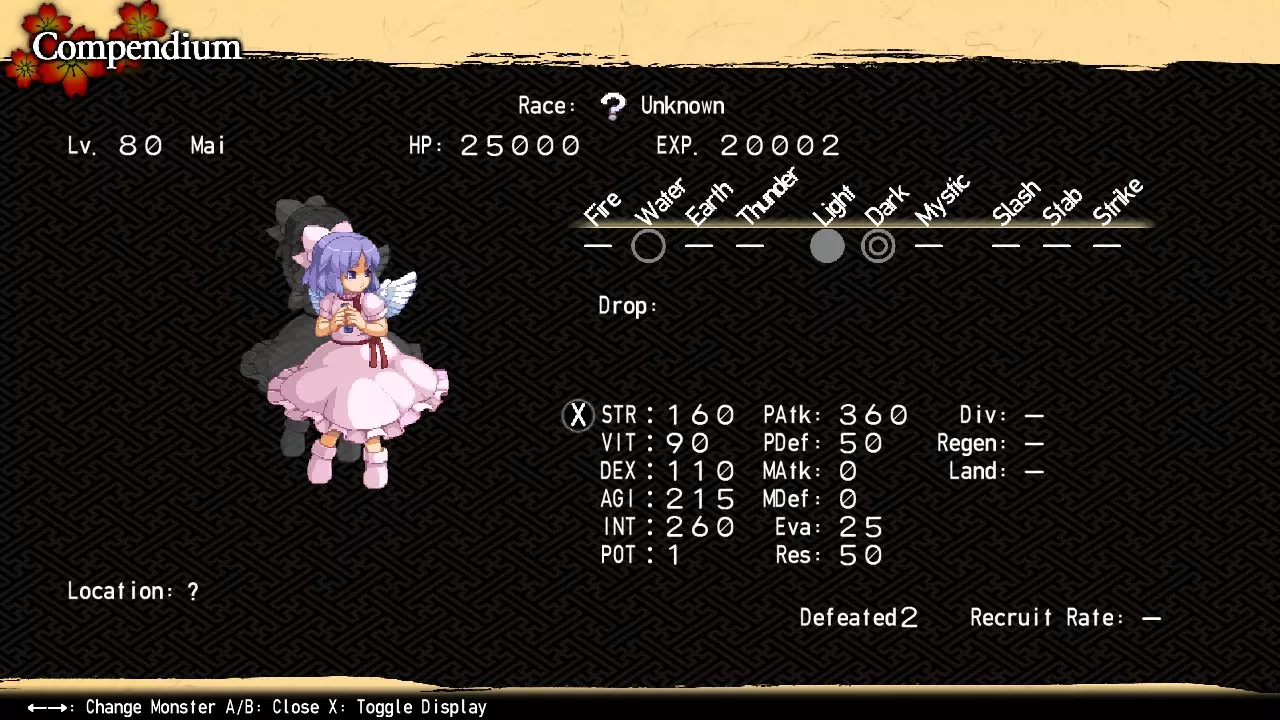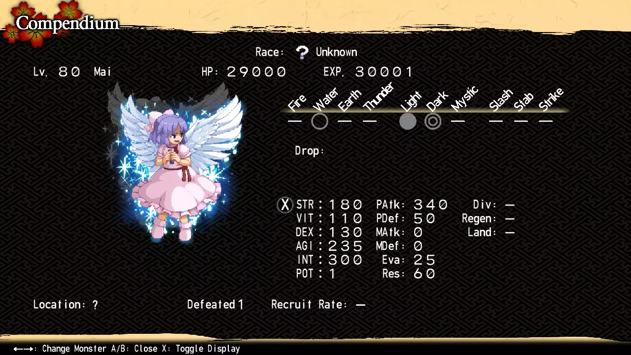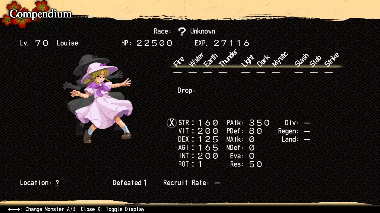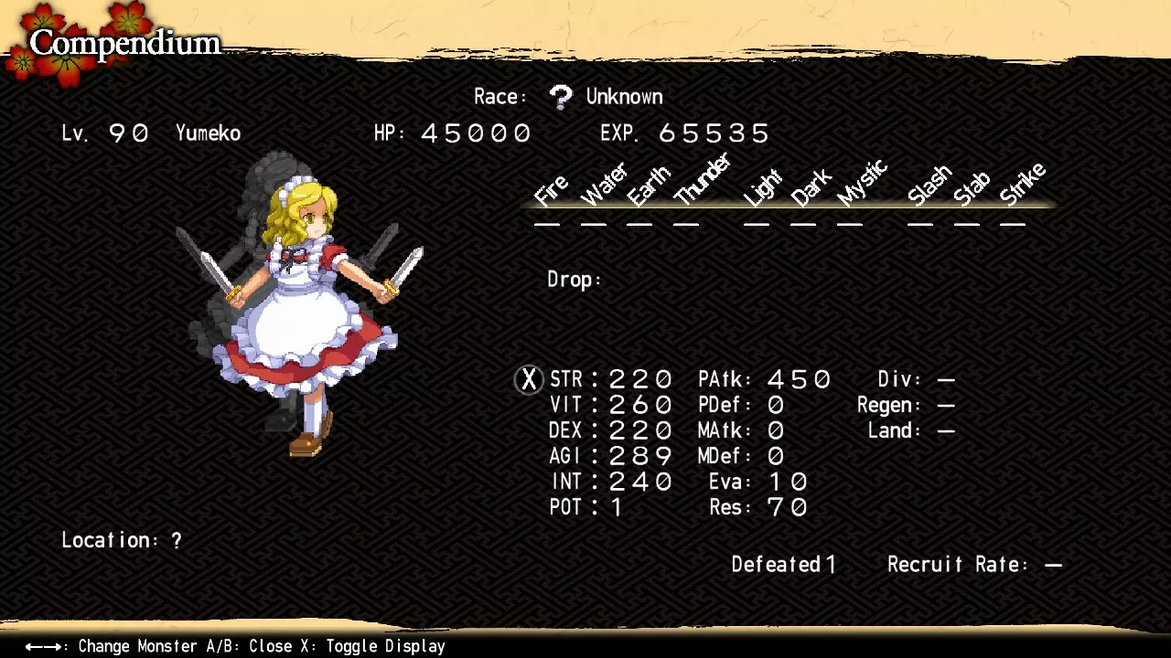 因此,神绮拥有三个阶段的力量(每个阶段都收录在图鉴中)。对于你的第一场战斗,我强烈建议激活一个或两个封印。此时击败未封印的神绮虽然并非完全不可能,但达到99级并获取混沌冥界和博丽神社地下的资源会让这一挑战变得更加可行。任何标有【*】的内容仅在 bonus dungeons 中出现,因此只能在重战时用于尝试击败神绮的强化形态。 【游戏后期最终头目】 神绮 位置:内黑圣所17区北部