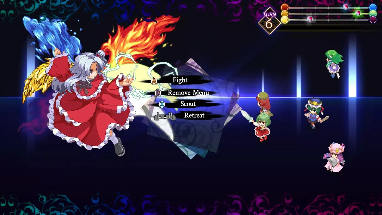 可恶,这么快就要重赛了?这两个家伙基本没什么变化,唯一真正的不同就是属性降低了,现在她们每回合只能行动一次,而且萨拉的第一回合不再固定了。除此之外,只要用第一次削弱萨拉时的相同策略,同时慢慢消耗露易丝,这两个家伙很快就会被打回斗技场之外。 注意:虽然这三场战斗是连续的,但你不必连续获胜。失败不会让你从这场战斗重新开始,尽管场景设定看起来是那样。 【鹤翼大舞】 地点:恶魔斗技场区域6