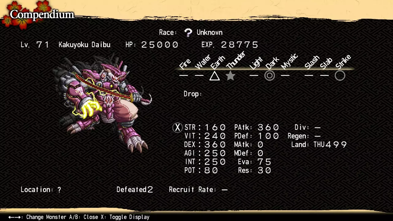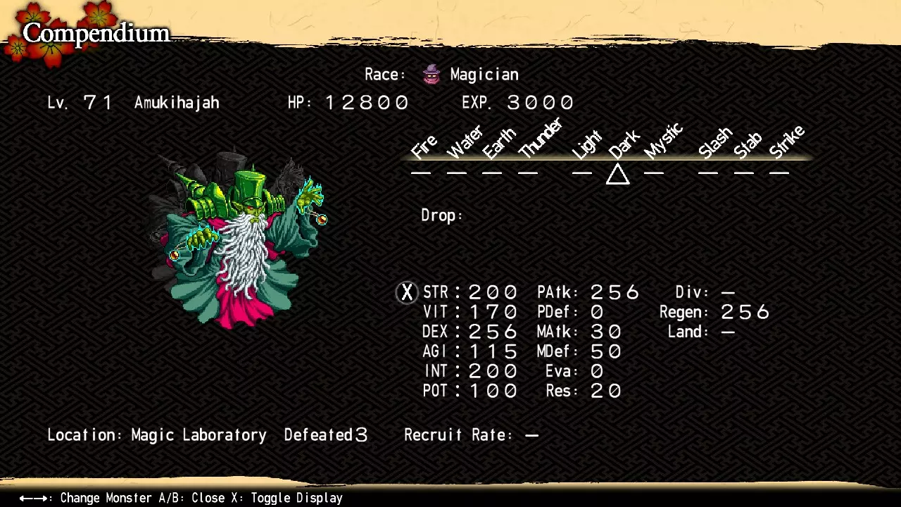 大体上,角翼大武与初次战斗相比基本没有变化,只是属性有所提升,但他现在可以用【干扰(土属性)】反击土属性攻击,并且有机会召唤一次埴安太岁来协助战斗。埴安太岁同样与初次战斗相比基本没有变化,只是属性有所提升,但他现在能够设置【再生】状态,并且会优先为角翼大武施加增益效果,而不是直接攻击你(只要角翼大武还没有获得全部增益)。只要你持续驱散增益效果,埴安太岁就应该不会进行攻击,这意味着你只需专注于防御雷属性攻击,而不用同时防御雷属性和土属性攻击。不过,如果埴安太岁出现,一定要优先将其击败。如果角翼大武先被击败,埴安太岁会进入狂暴状态,并开始连续使用【蛇形封锁】和【涅槃莲华击】。除非你对打击伤害有极高的抗性,或者埴安神大祖的生命值较低,否则这基本上就是失败状态。 虽然我自己从未成功过,但埴安神大祖对即死效果(尤其是分解/粉碎类型的)是脆弱的。如果你难以击败他,可以尝试将敏捷属性尽可能堆高,然后使用高概率即死技能,比如【狂怒】(电子乌贼1级)。 注意:如果在角翼大武召唤埴安神大祖之前击败他,你将错过埴安神大祖的第二个图鉴条目。不过,你不必在击败埴安神大祖的同一局游戏中击败角翼大武,也能保留他的图鉴条目。 魅魔 位置:恶魔斗技场区域6