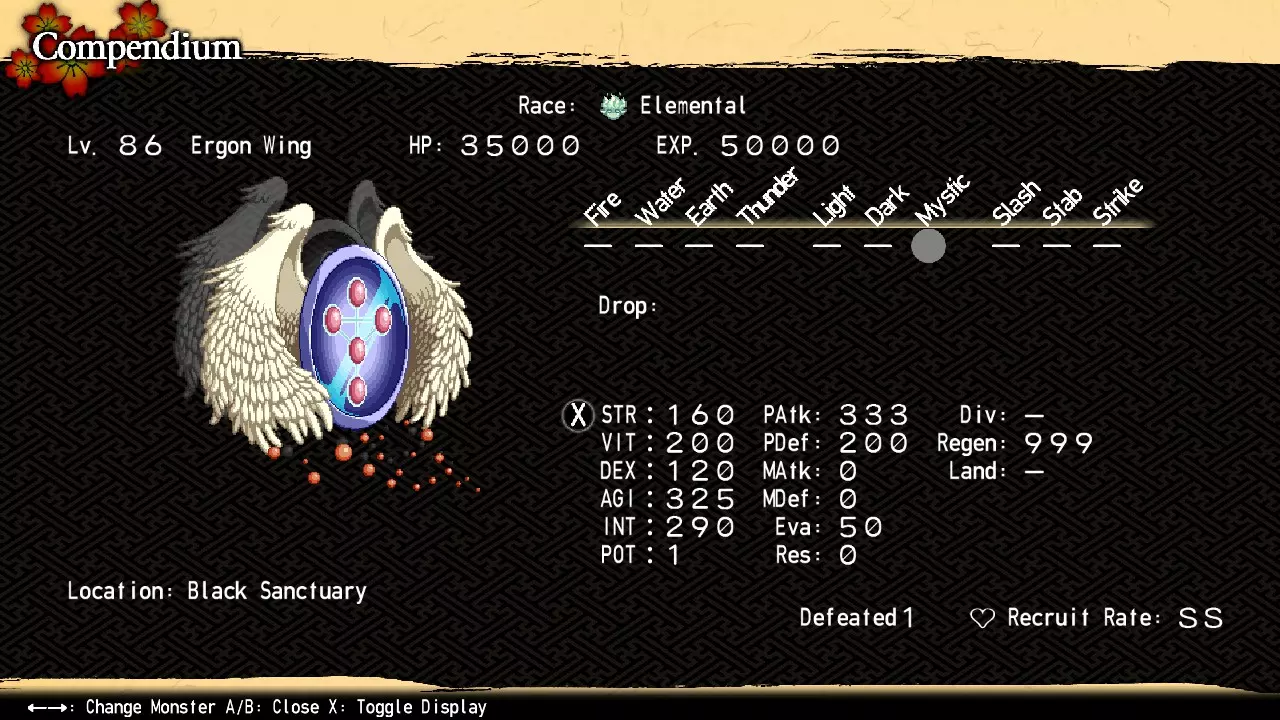 麻衣会在第一回合使用背叛系技能【犹大的背叛者】,这是一个强力的暗属性法术,会攻击所有队员。之后,她每回合行动两次,并可使用吸血、乱射、能量之手、绝对零度、钻石星辰、狂气之声、漩涡以及背叛系技能【犹大的背叛者】。基本上,你用于雪绪的策略同样适用于麻衣,只是将火属性和水属性互换即可。 注意:如果你需要额外的战力,可以完成可选的矿山探索,并通过另一个终焉钟楼,但你需要清理完两座钟楼才能继续前往黑色圣所。 额外章节2 - 黑色圣所 埃尔贡之翼 位置:黑色圣所区域11