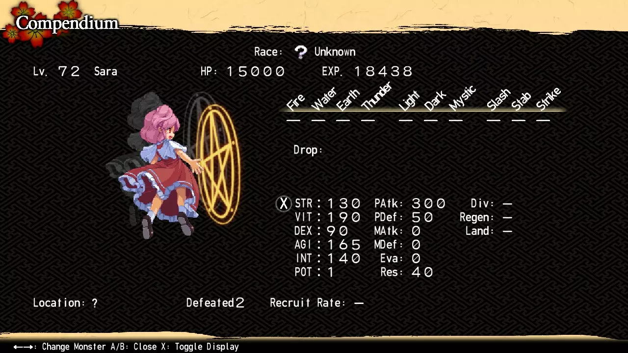 作为游戏后期遇到的首个头目,应龙为后续战斗奠定了基调,而它的基调相当棘手——其生命值与安格拉第二阶段相当。根据日文维基的信息,它的攻击模式【本应】如下: 地狱之火→冰冻暴雪 毒瓦斯→强袭闪电 地狱之火→冰冻暴雪 毒瓦斯→强袭闪电 漩涡→核子吐息 然而根据我的实际体验,战斗模式却始终是这样的: 地狱之火→火焰打击/普通攻击 毒瓦斯→地面冲击/毒之手 冰冻暴雪→冰冻冲击 强袭闪电→闪电斩 漩涡→吸入→核子吐息 或许这是针对Steam版进行的更新?幸运的是,这样操作起来肯定更简单。只需按如下方式循环使用你的技能: 火焰屏障(Burabura等级1) 元素之墙(土)(爱丽丝等级1,幽香等级25) 水流屏障(Buruburu等级1) 元素之墙(雷) 慈爱屏障(勇仪等级45,G.Matter等级57,采矿村等级44)+复活(辉夜等级40,铃仙等级1,斯塔等级14,阿求等级1,莉莉白等级1,毛玉等级1,油库里王等级30,妹红等级25)/灵药(阿求等级31,独角兽等级42)|彩虹符「彩虹风铃」(仅限美玲路线) 如果它仍能使用旧模式,调整起来也不算难。只需在第1和第3回合同时使用火焰屏障和水流屏障,在第4和第5回合同时使用爱丽丝和幽香的元素之墙即可。如果你出于某种原因不想使用【慈悲之壁】,就需要为队伍装备抵抗神秘伤害的能力,以承受【核息吐息】。在进攻方面,物理剑士角色应频繁使用【龙斩】(并且你的最强剑士应专门装备【尼格尔圣剑】),而其他所有人则集中输出暗属性伤害。如果你拥有【冥界解放】,其提供的25%暗属性伤害加成会非常有帮助。记住,它可能会在任意回合结束时使用【超级治愈】,不过这最多只会拖延不可避免的结局。 这场战斗可能相当可怕,但只要你一直认真收集和培养式神,就能轻松削弱它的威胁。从这里开始,预计会有更多类似的战斗。 萨拉 位置:地下水路12区