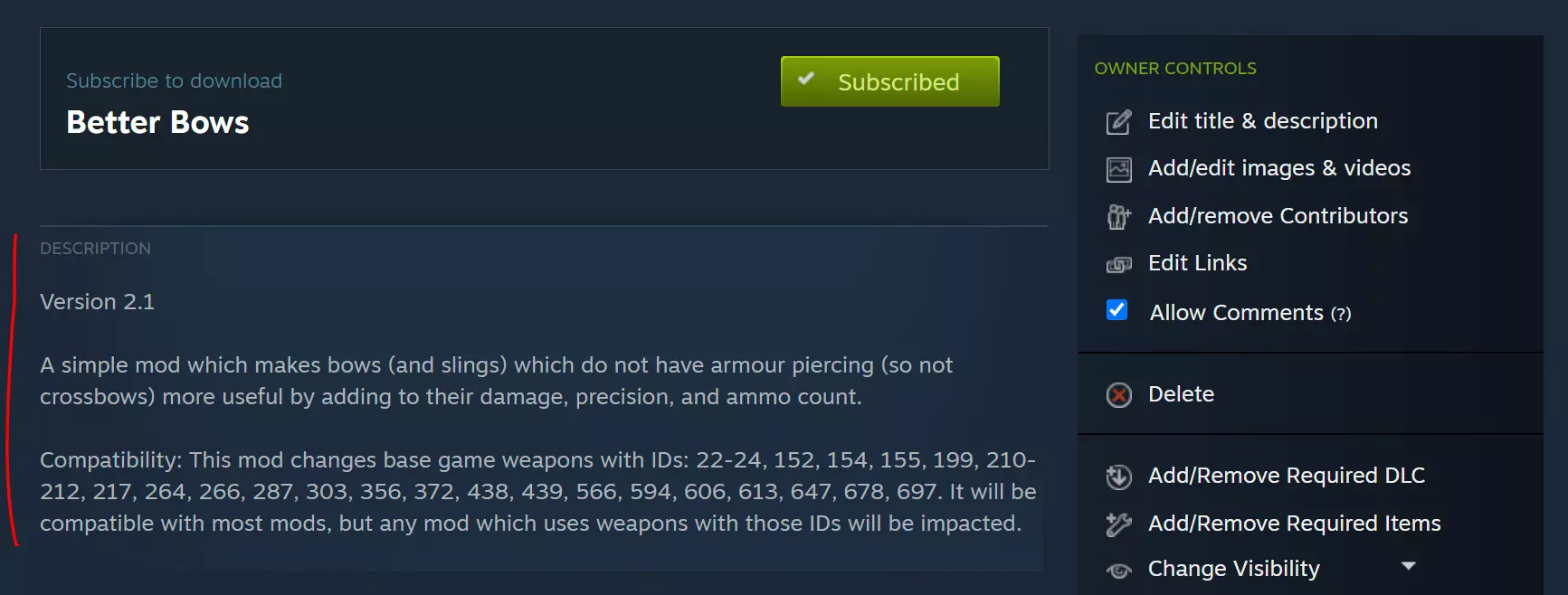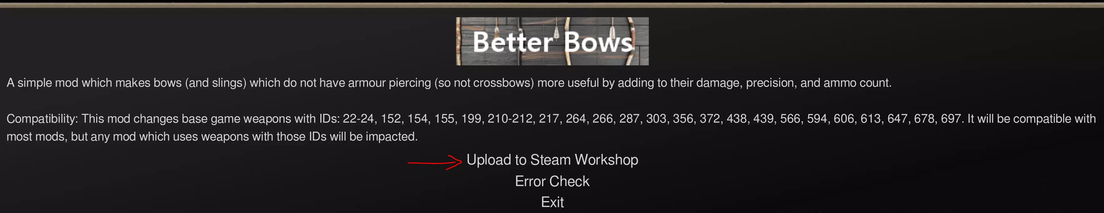 现在系统会提示你对所做的具体更新进行描述。无需在此处描述模组,我们稍后再处理。由于这是你首次上传模组,你可以直接填写“版本0.1,首次将模组上传至创意工坊”。 你的模组现在应该开始上传了。需要注意的是,模组文件夹内的所有内容都会被上传。这可以包括多个.dm文件,让你能够一次性上传多个版本,或者在单个创意工坊项目(即模组包)中包含多个功能不同的模组。 这很简单,但接下来该做什么呢?如何向用户描述它? 现在你需要查看刚刚上传的创意工坊模组,并提供描述,以便其他人了解该模组的相关信息。要找到您自己的创意工坊内容,请点击Steam工具栏中的您自己的名称,然后依次点击内容、创意工坊项目标签。现在您可以看到所有已上传的内容。点击您刚刚上传的模组,即可编辑该项目的描述、添加预览图片、链接、其他贡献者、视频等内容。 主要操作是点击编辑标题和描述,确保您对展示给用户的信息感到满意。 我个人喜欢从模组的#description字段中提取信息,并确保提供某种说明,帮助用户了解哪个版本是模组的最新版本,以及它是否可能与其他模组兼容。例如在Better Bows模组中: