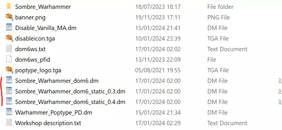 此工坊项目包含5个.dm模组文件。其中两个是补充性模组(战锤兵种类型和禁用原版主时代),它们不太可能发生变化或导致问题。另外三个则代表了该模组的不同版本。 有一个静态的0.3版本,虽然已过时,但仍支持那些已使用0.3版本开始游戏的玩家。该文件将包含在未来的更新中,并且永远不会更改。 还有一个静态的0.4版本,在撰写本文时是最新版本,但当0.5版本更新推出后,它自然就不再是当前版本了。玩家可以使用此版本开始新游戏,无需担心更新会导致游戏出现问题。 最后是一个当前的动态版本。目前,该版本与静态的0.4版本(尽管在游戏中标题为“阴沉战锤当前版本0.4”),但此文件会在更新时发生变化,因此仅应由模组制作者以及愿意承担风险(即使用此模组开始的任何游戏可能会因更新而中断)的用户使用。 当我对模组的0.5版本进行更新时,也会包含一个静态的0.5版本文件,后续版本以此类推。 遵循这一最佳实践,能让玩家放心地使用你的模组开始游戏。