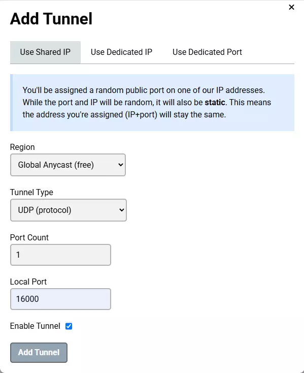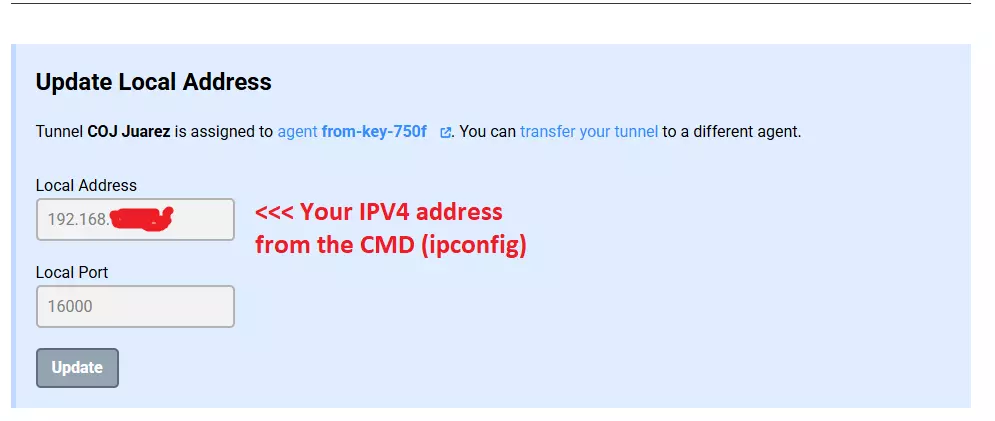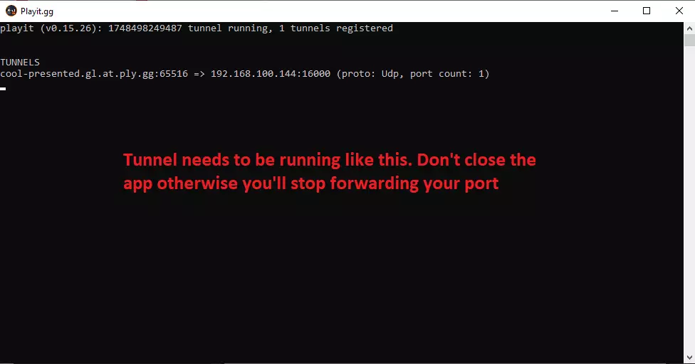 更新后启动你的隧道。你还将获得准备好的IP和端口地址(不要复制字母地址和端口,只需复制数字IP和端口)