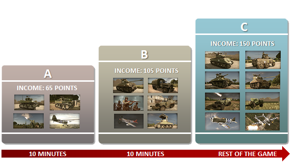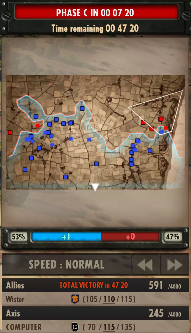 在战场上承受的压力越大,战斗效率就会越低。※这会影响命中率 当压力值达到最大时,车辆单位会撤离战线,空中单位会离开地图。 步兵的压力值达到最大时,会进入【压制状态】(Pinned Down),无法移动且不接受命令。此时按下撤退的【R】键下达撤退指令,步兵就会后退并躲到遮蔽物后。若成功避开敌人攻击,数秒后即可恢复正常。 如果单位在敌方区域压力值达到最大,且被敌人逼近,同时附近没有友军的话,就会投降。(空中单位不涉及此情况) 胜利条件有以下三种以下是两种游戏规则: 征服模式:团队根据对地图的支配比例获得积分:支配51%得+1分,58%得+2分,65%得+3分,75%得+4分,85%得+5分,95%得+6分。 毁灭模式:通过击败敌方单位获得积分。支配区域越多,每秒所需积分增加越多,且每个阶段会重置。 胜利条件: 率先达到设定的征服点数(Conquest Points)者。 消灭所有敌方单位者。 在限制时间内获得最多点数者。