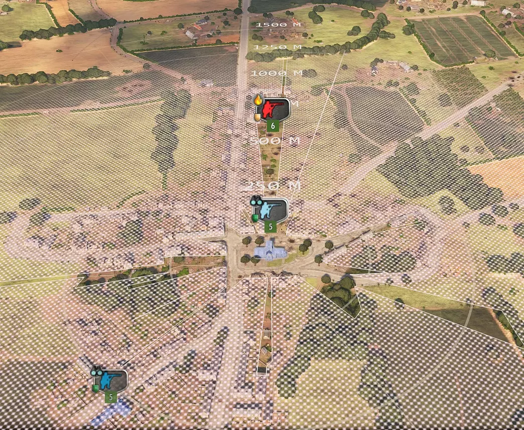 如图所示,可以看到坦克在猎杀模式中向市区前进。 不同行动可以通过线条颜色来确认: 水色:常规移动 青色:快速移动 赤色:攻击模式 视野工具(“C”键):显示光标位置的视野和距离。 一个圆圈=250米。白色涂抹部分为无法目视区域。该工具对于了解更佳位置非常重要。