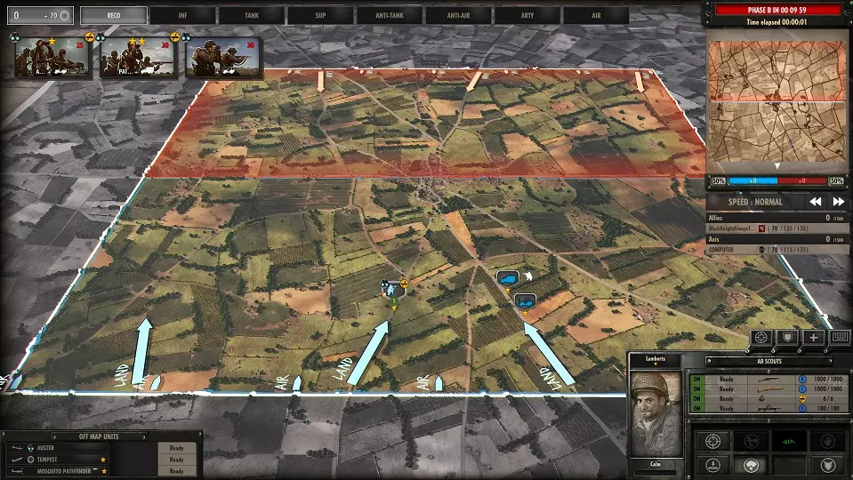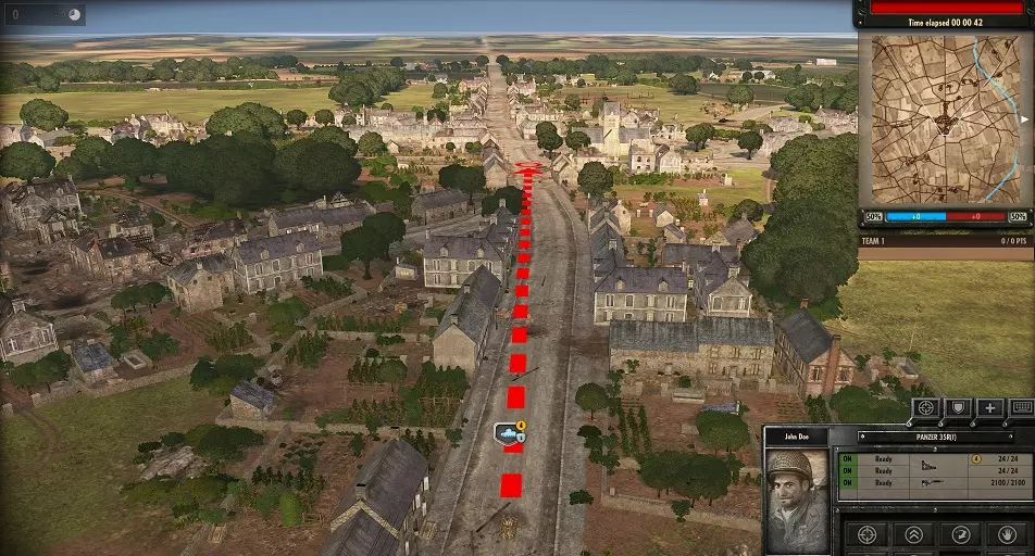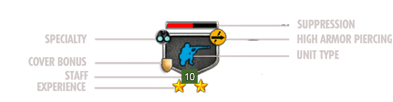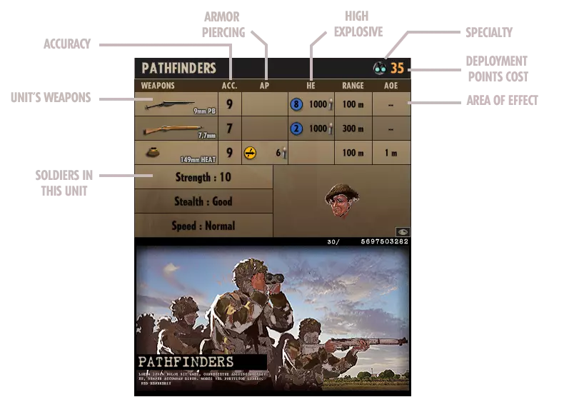 穿甲弹(AP)对装甲车辆有效。 高爆弹(HE)对步兵和轻型车辆有效。 将单位添加到战斗群可通过拖放或右键点击。右键点击可移除单位。 单位部署: 战斗开始前,可在被你的颜色包围的区域部署单位。部署方法为:点击屏幕左上角的部署菜单,从类别列表中选择单位。在地图上部署时,选择单位卡片并在任意位置左击。右键点击可取消部署。