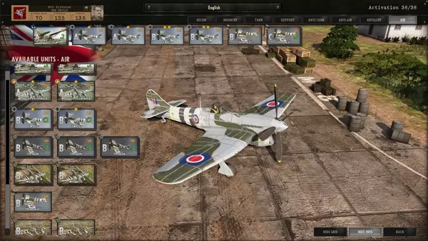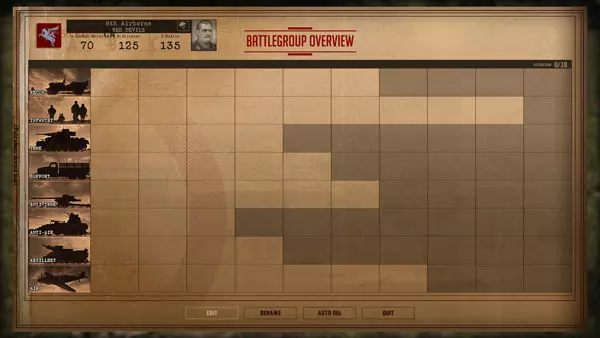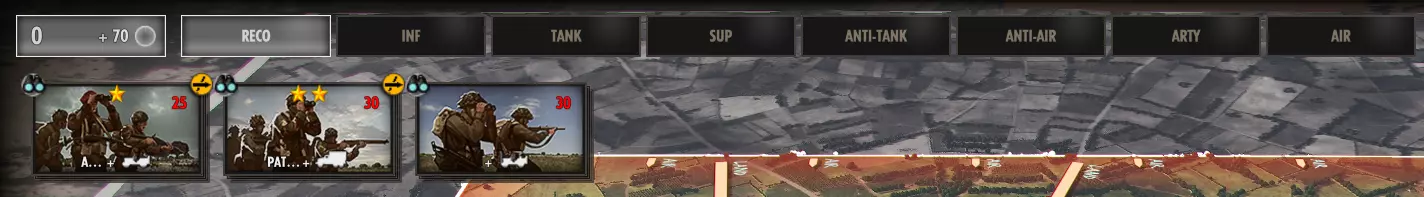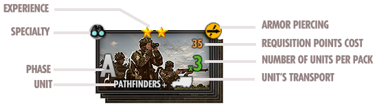 战斗群拥有固定数量的激活点数,可在屏幕右上角查看。将单位编入卡组会使该数值增加。单位类别如下: 侦察 - 侦察 步兵 - 步兵 坦克 - 坦克 支援 - 支援 反坦克 - 反坦克 防空 - 防空 炮击 - 炮击 飞机 - 飞机 点击屏幕上方的类别,屏幕左侧会显示相应的单位卡片。