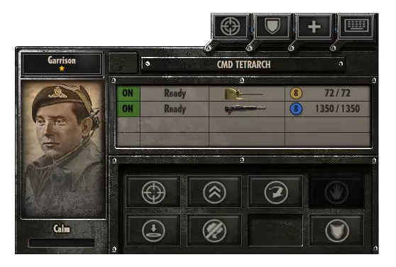 画面右下角为单位控制区域,可进行指令操作及武器开关设置。此外,还能查看剩余弹药数量、士兵压力值等信息。快捷键 视角移动 键盘控制 - Qwerty布局 W - 上 S - 下 A - 左 D - 右 键盘控制 - Azerty布局 Z - 上 S - 下 Q - 左 D - 右 鼠标 中键 + 移动 - 旋转 滚轮 - 放大/缩小 单位控制 左键 - 选择单位(按住可选择多个单位) 右键 - 移动至光标位置 Q或A + 左键 - 追击 F + 左键 - 快速移动(仅限车辆) U - 卸载(仅限人员搭载车辆) Y + 左键 - 在指定位置卸载 T - 向指定位置开火 B + 左键 - 向指定位置释放烟雾(仅限炮兵) E - 停止移动和开火 W或Z - 反击(受到攻击前不主动攻击)R - 撤退恐慌状态的单位(使处于恐慌状态的单位撤退)J - 坦克倒车(保持面向前方进行倒车) C - 视野 N - 开启或关闭自动掩护(自动掩护的开关)