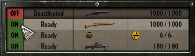 在图示场景中,进入教堂的士兵发现了视野内的敌军。因此,前方视野外的友军士兵也能知晓敌军的位置。 侦察:侦察单位具有特殊性,与其他单位相比性能较为有限,且不会对【动态前线】产生影响。因此,它们能够探索敌方控制区域。 侦察单位较为脆弱,使用时需格外小心。要善于利用掩护隐蔽自身,避开敌人的视线。 建议将侦察单位部署在塔楼等高处。始终保持低调,最好关闭武器使用功能,避免被敌人发现。武器的启用/禁用可在以下界面切换。点击武器旁边即可。