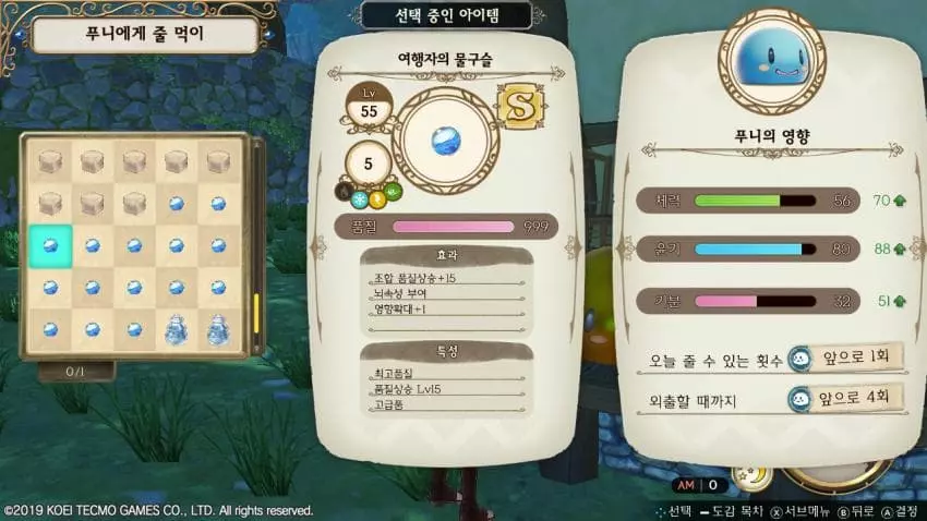 体力/光泽/心情分别为70、88、51,一天结束。第二天将剩余的3次机会全部用旅行者的水珠来喂食的话
