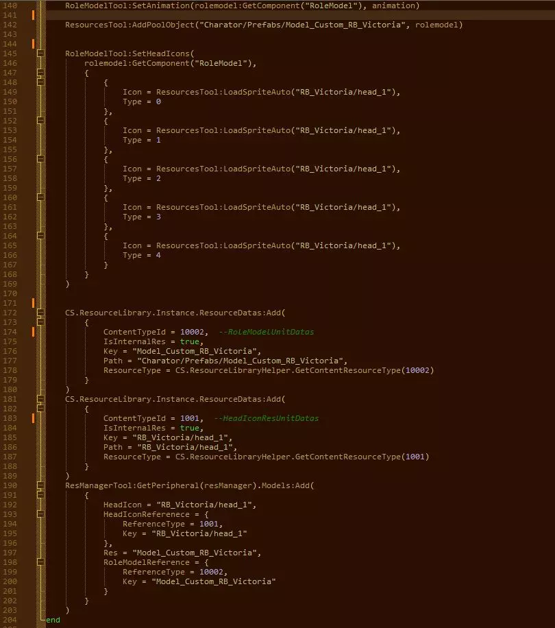 首先是ResourcesTool:AddPoolObject("Charator/Prefabs/Model_Custom_RB_Victoria", rolemodel) 此处路径应如下所示:Charator/Prefabs/[模型自定义位置] 记住预制件中模型的位置和预制件中的文件夹名称,后续会用到。 接下来设置自定义头像 Icon = ResourcesTool:LoadSpriteAuto("RB_Victoria/head_1"), – 此处角色头像路径的设置方式与为动画设置精灵的方式类似。类型=0——表示某种未知内容(动画/对状态的反应?)。请勿修改。 接下来4行类似,只是类型不同。 然后按照上方示例修改Key、Path、HEadIcon、Res等变量。根据示例,填入预制体路径、预制体路径中的自定义文件夹名称或肖像图片路径。实用信息 动画与声音同步 脚步声仅在跑步和走路动画时播放。 走路时:声音每6帧动画重复一次,且在开始时额外增加1帧。 跑步时:声音每4帧动画重复一次。 若模型未显示,且存在其他模型模组 这意味着您的模型名称或精灵文件夹名称与其他模组中的名称相同。如果模型没有显示,且没有其他模型mod,说明你没有安装那三个必要的mod,或者修改了文件开头的“Charator/Prefabs/Model_Custom_000”数值。 如果游戏中只显示一个官方模型(粉色头发女孩),说明你在设置精灵连接或配置文件其他地方操作有误。 结语
