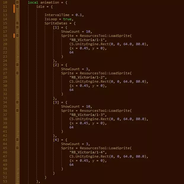 没关系!现在我们来分析每个参数。 Idle = {(或walk或run)——这是动画类型,分别对应待机、行走和奔跑。这些不要动。 IntervalTime = 0.1,——帧长度(不过看起来没什么作用) IsLoop = true,——动画是否需要循环。嗯,无论如何我们都需要动画循环播放。 [1] = {——按顺序的帧编号。 ShowCount = 10,——每个精灵的帧数。数值越大,精灵在屏幕上停留的时间就越长。 “RB_Victoria/1-1”——精灵路径。还记得在上一部分中命名的文件夹吗?路径的格式为[文件夹名称]/[精灵名称]。 CS.UnityEngine.Rect(0, 0, 64.0, 80.0)——精灵尺寸。前两个数值分别是左上角在x轴和y轴上的位置(你很可能不需要修改这两个数值)。最后两个数字分别是右下角在x轴和y轴上的位置(你很可能需要将精灵大小设为这些值)。 {x = 0.45, y = 0},这很可能是偏移量,但不确定。 动画中最后一个精灵的逗号应该像上图第4帧那样去掉。 行走和跑步的设置也与此类似。精灵连接 要进行连接,需要编辑十几行代码,最重要的是不要触及任何无关内容。 负责连接的是以下代码部分: