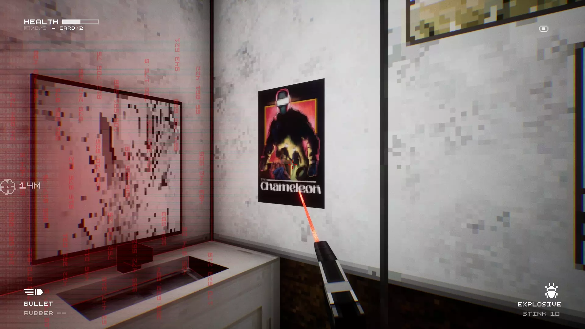 再经过几个房间后,你会进入一个装有监控摄像头的房间。你的无线电盟友达瑞斯·戴维斯会就此发出警告。在那个房间的出口附近,有一扇通往浴室的门。拿出你的枪,用任意子弹射击“变色龙”的海报。最好使用橡胶子弹,因为它是无限的。