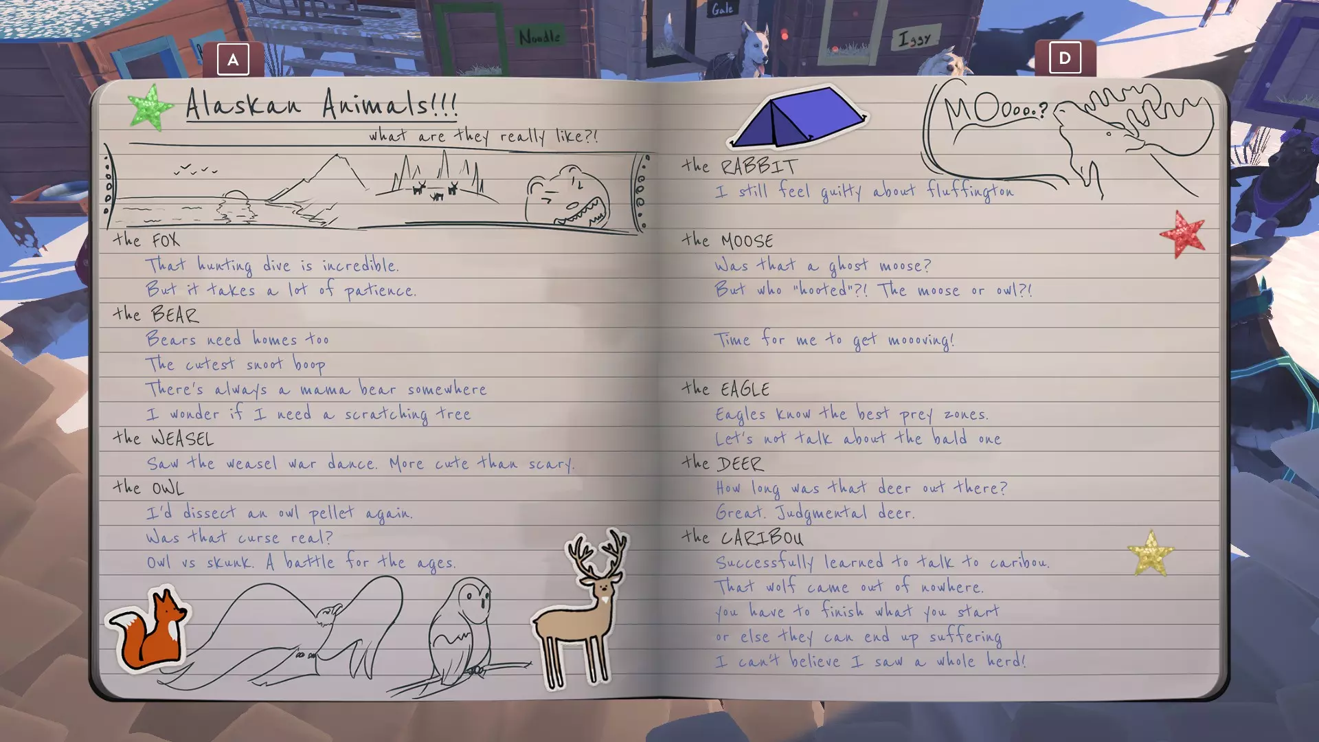 *)【险避海狸袭击】:当海狸导致树木倒在小路上时,调查钓鱼点,但不要选择钓鱼,而是选择寻找海狸。第二棵树会倒下并险些砸到你。不要猎杀海狸。(从一开始就不要选择猎杀海狸,否则你会受伤。) *尽管这会触发通知,但不会在日志中添加条目。 狗狗 本节详细说明如何解锁每只狗狗的故事。你必须到达小屋才能获得成就/饰品。否则,下次出发时狗狗的故事将重置。到达小屋后,你可以选择让谁带领队伍。为了更容易触发特定狗狗的故事,你应该让它们成为领队。 冰屋: