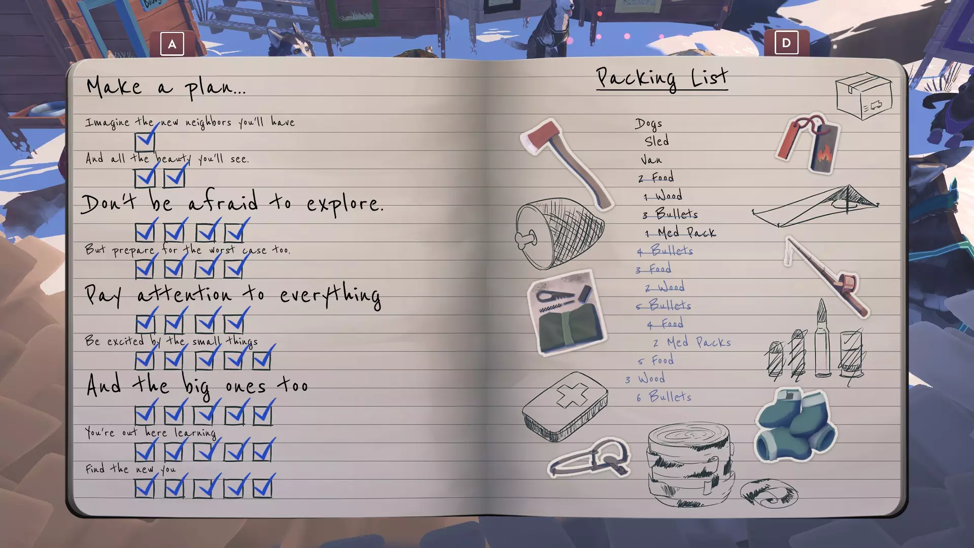 装备的位置在每个存档中似乎是随机的。唯一与环境相关的似乎是鱼竿。一旦找到装备,无论是否成功抵达小屋,在后续的每次游戏中你都将保留该装备;因此,找到装备后无需担心会丢失任何东西! 斧头:你会看到一片桦树丛。大多数树都是树桩,你可以从小径上看到斧头。调查并将其带走。 -这将让你无需额外消耗饥饿值就能收集树皮。你仍需消耗正常的饥饿值来停留并触发事件。斧头还能让你从多个事件中收集到额外的肉,以及闯入一间废弃小屋。鱼竿:当在冰面上行进时,赶狗人会提到在水上感到不适。你会看到小径旁有一个钓鱼架。调查并拿起鱼竿。 -这将让你在沿途经过的任何钓鱼点无需使用子弹就能获取肉类。 火石:你会发现小径旁有一个看起来像是废弃的户外厕所。调查后,你会在火圈灰烬中找到一个引火物。带上它。 -这将让你在营地生火时无需桦树皮。 陷阱:狗会在小径上闻到什么东西。跟着气味走,你会发现一堆骨头和一个陷阱。带上它。 -这将让你在营地设置陷阱。你需要睡觉才能捕捉到东西。如果让斯蒂尔顿选择放置陷阱的位置,你将获得两块肉而非一块。 枪支清洁工具包:你会看到一间整洁的小屋, mushers(赶狗拉雪橇的人)会说想在那里蜷着休息。调查并使用工具包。你需要斧头来开门。 -这将使你从狩猎中获得的肉量增加1。这个工具是唯一解锁后不会在棚屋里实际显示的工具。不过不用担心,增益效果不会消失。 狗靴:mushers(赶狗拉雪橇的人)会提到小路上有垃圾。选择跟着垃圾走,你会发现一袋狗靴。带上它们。 -这些靴子(除了让你的小狗看起来很可爱!)会使你喂给狗狗一块肉时它们获得的能量翻倍。它还会将狗狗能量条中间的爪子图标变为小靴子图标。 首次找到一件装备时,将解锁成就Find a helpful tool。 第二次找到一件装备时,将解锁成就Find another tool that was left behind。 找到所有装备后,将解锁成就Discover all the gear。 日志条目