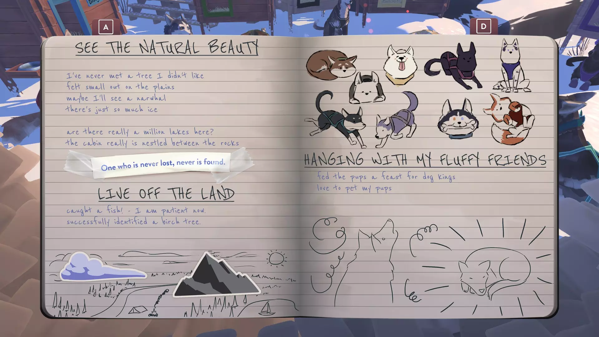 领略自然之美 - 见过平原 - 在你开始第一次旅程时触发。 - 见过森林 - 当你穿过树木繁茂的区域时触发。 - 在结冰的湖面上奔跑 - 你需要跑过地图上的第一个湖泊;连续选择三次“向右”应该会触发。 - 沿着河流奔跑 - 当你穿过地图上标记的任意一条河流时触发。 - 见过海岸 - 你需要到达地图的南端;持续选择“向右”直到通知弹出。从 trail 起点开始大约需要七个回合。 - 找到家 - 成功抵达小屋。(成就) 靠山吃山 - 识别出白桦树 - 在任何你提及该树的事件中均会触发。 - 在新地方钓鱼 - 如描述所示,你必须钓到一条鱼。(成就) Hanging with my Fluffy Friends -给狗狗们喂一顿饱饭 - 在同一餐中给狗狗们三块肉。(成就) -抚摸所有狗狗 - 抚摸所有不同的狗狗。 *每次完成一只狗狗的故事,你将获得该狗狗的贴纸。 阿拉斯加动物
