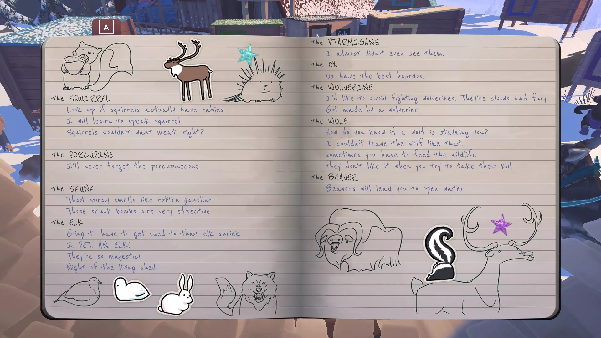 巴克利的故事始于一只狼在你的雪橇旁奔跑。它会攻击你,但巴克利会介入并替你受伤。向狼扔一块肉会让它逃跑,同时还会获得一个日记条目。(当巴克利不在你的队伍中时,可能会发生此事件——在这种情况下,你会受伤。)一定要给它揉揉肚子,因为它是个好孩子!然后在营地继续为它包扎伤口并抚摸它。 之后在小路上,乔姆珀会发现一只松鼠,你将被迫跟着它。松鼠会坐在一根原木上和乔姆珀对峙。接着这只啮齿动物会把怒火转向你,但巴克利会再次介入,在它伤害你之前杀死松鼠。你需要训斥巴克利,并当场教它正确的做法是吠叫而不是咬人。你需要选择【吠叫!】选项来让它学习。 在你的旅程接近尾声时,你会在小路上遇到一头驼鹿,它会非常粗鲁地撞倒你。巴克利会用它新学会的吠声吓跑驼鹿,这样就没人会受伤了!回到营地后和它对话,并成功抵达小屋,以完成它的故事。 杂货店: