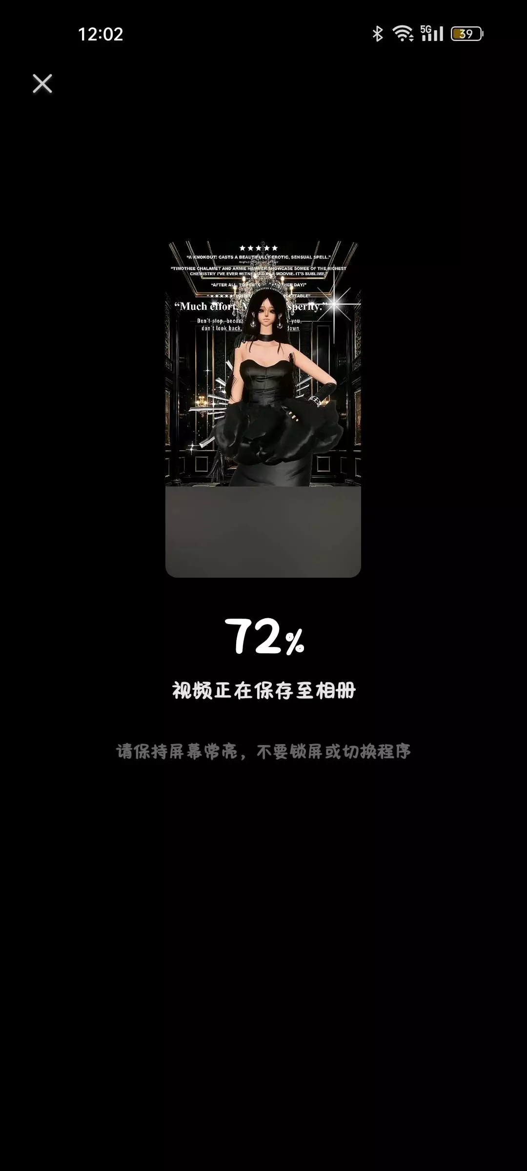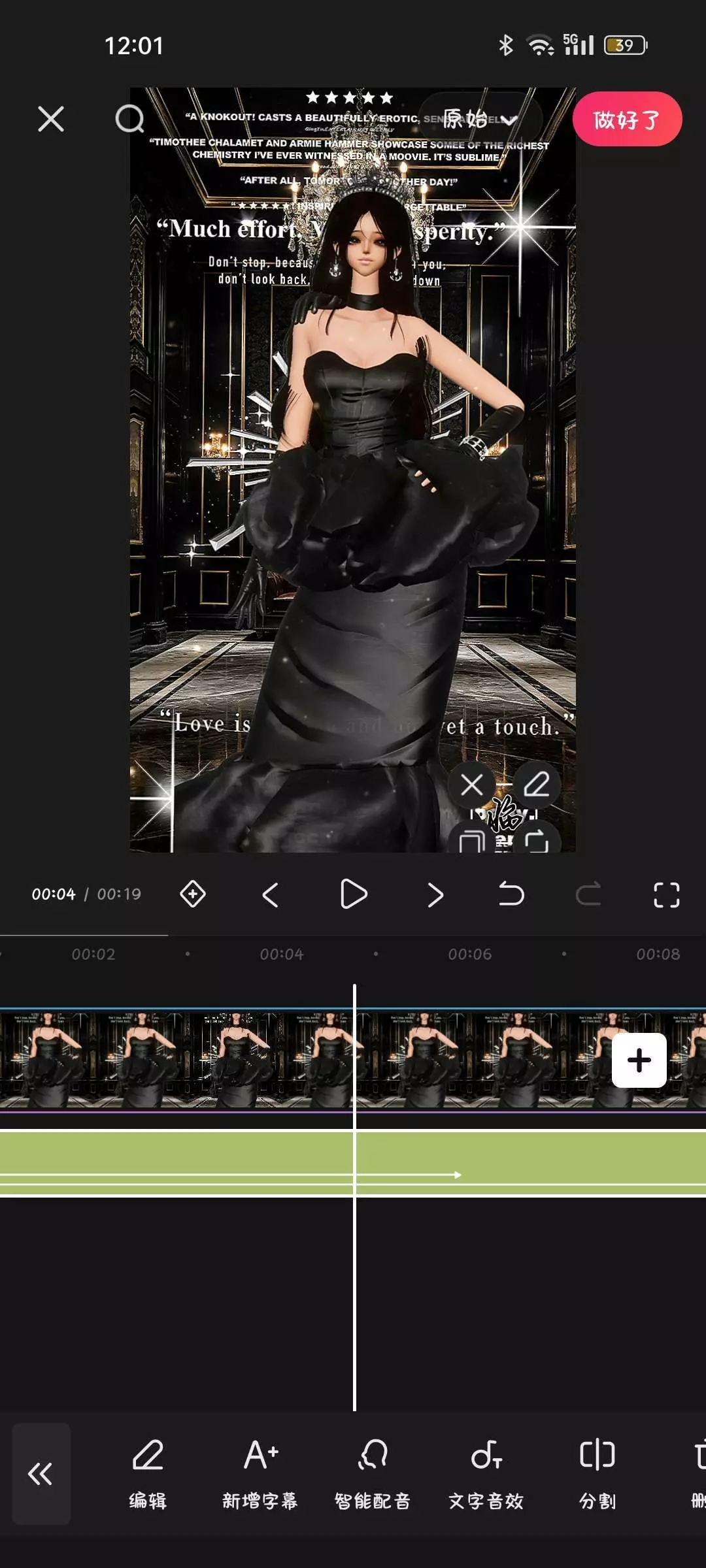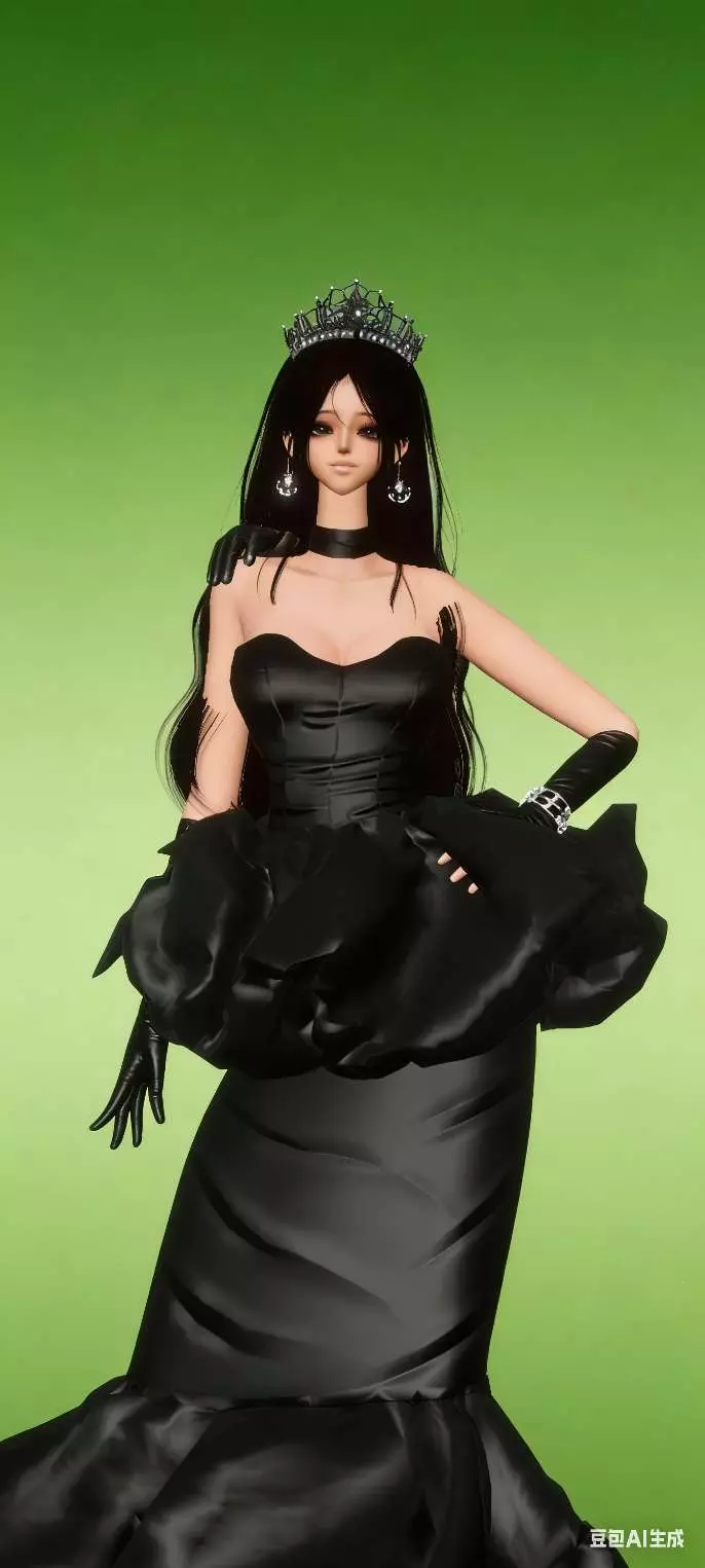 这是一篇虚拟穿搭分享帖,展示了游戏中虚拟角色的黑色礼服穿搭,还呈现了将该虚拟形象搭配AI生成场景,进行视频剪辑制作的过程,包含添加音频、特效、字幕等操作,最终产出带有特效的虚拟形象视频。