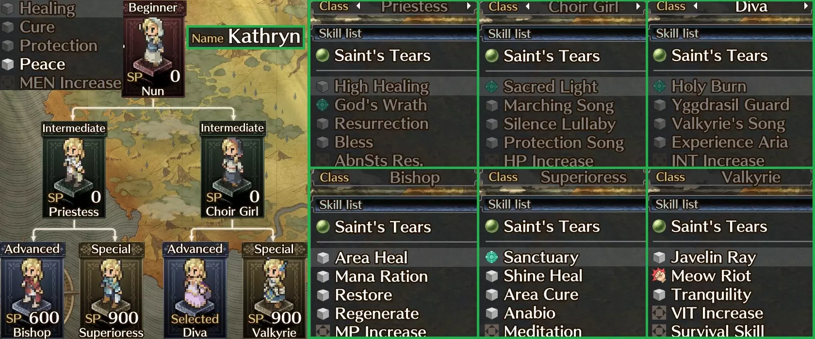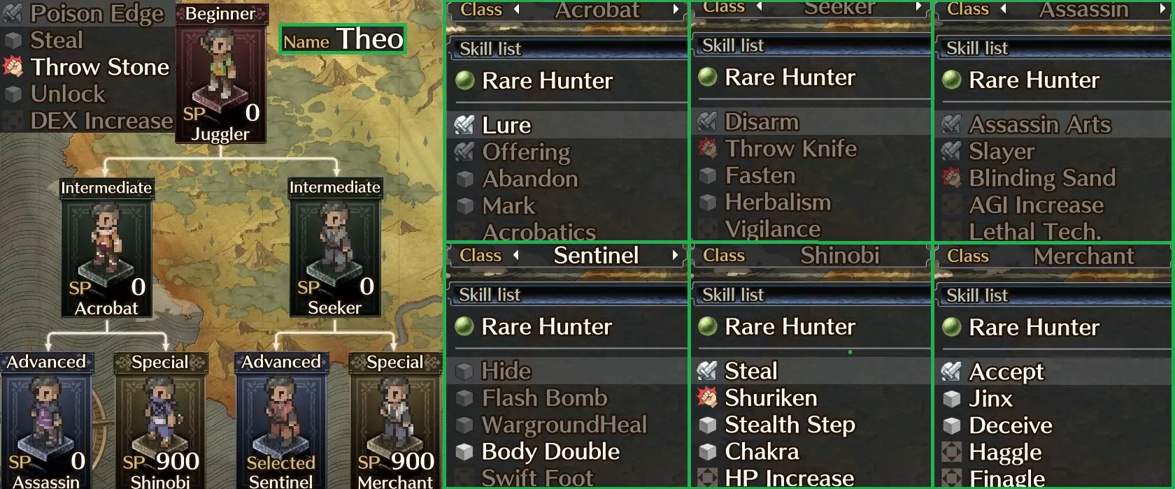 在我看来,费伊客观上比梅丽莎更强,因为她拥有大地之魂和解放技能。拥有大地之魂意味着在长时间战斗中,她需要更少的MP恢复率装备就能使用地震技能。解放技能还能减少多尔顿和凯瑟琳的行动回合。此外,她还能召唤精灵,是个全面性很强的角色。 值得注意的技能: 攻击魔法 - 地/火/冰属性,后期可习得陨石 召唤精灵 - 可召唤大盗贼,其背刺伤害(刺客技艺)和偷窃率都很出色 大地之魂 - 在各方面都优于 trance,能显著提升MP 解放 - 效果略弱于祝福,但属于范围型群体技能!地震 - 不会 miss,能确保费伊以极快速度升级 预言 - 大幅(+85)回避率 buff,在敌人逼近时效果显著 西奥 - 做好事的坏人(偷窃)